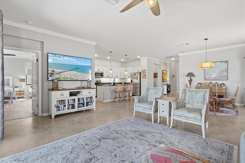 Split Bedroom Walk-In Closet(s)Ceiling Fan(s) High Ceilings Living Room/Dining Room Combo Stone Counters Open Floorplan Window Treatments Solid Surface CountersCrown Molding Primary Bedroom Main Floor Kitchen/Family Room Combo In Wall Pest System Pest Guard SystemОсобенности экстерьера: