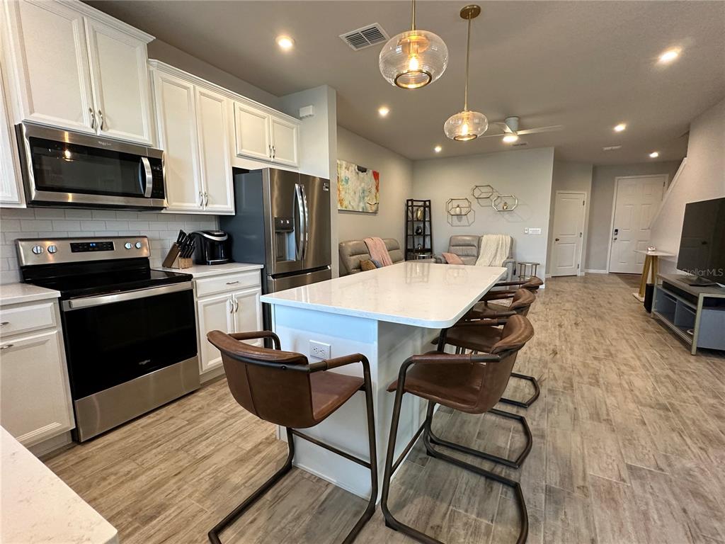 Ceiling Fan(s) Eating Space In Kitchen High Ceilings Stone Counters Thermostat Open Floorplan Window Treatments Solid Surface Counters Solid Wood CabinetsEquipment/Appliances: