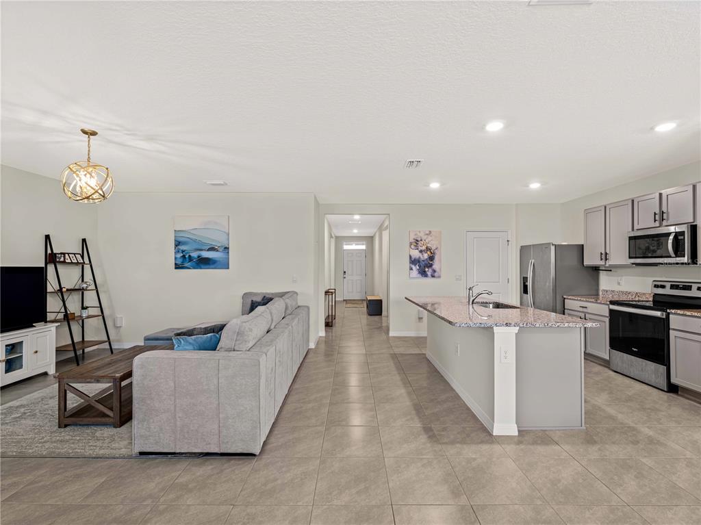 Split Bedroom Walk-In Closet(s)Ceiling Fan(s) High Ceilings Living Room/Dining Room Combo Thermostat Open Floorplan Window Treatments Solid Surface Counters Primary Bedroom Main Floor Kitchen/Family Room ComboExterior Features: