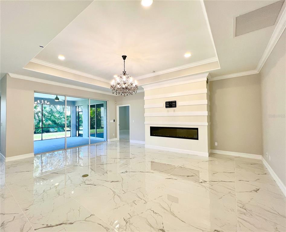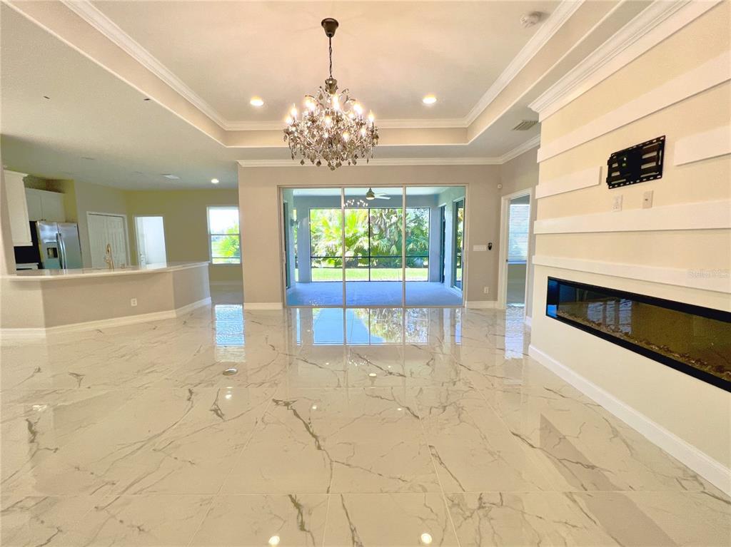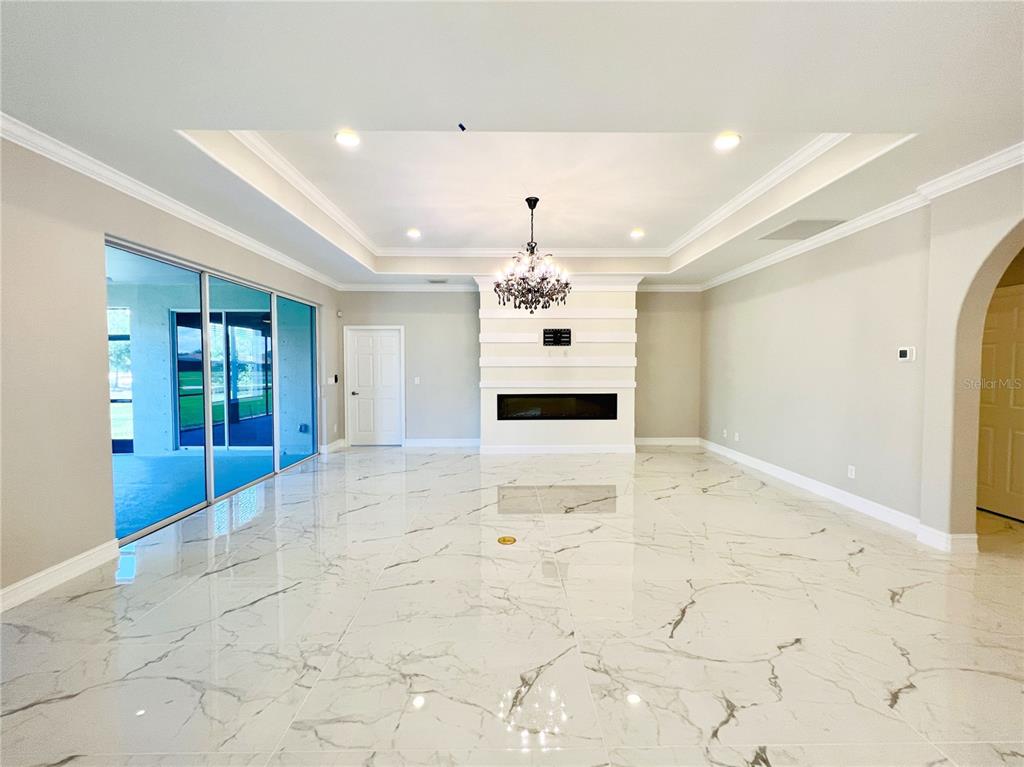 Split Bedroom Walk-In Closet(s)Ceiling Fan(s) Eating Space In Kitchen High Ceilings Living Room/Dining Room Combo Stone Counters Thermostat Open Floorplan Window Treatments Solid Surface CountersCrown Molding Kitchen/Family Room Combo Tray Ceiling(s)Exterior Features: