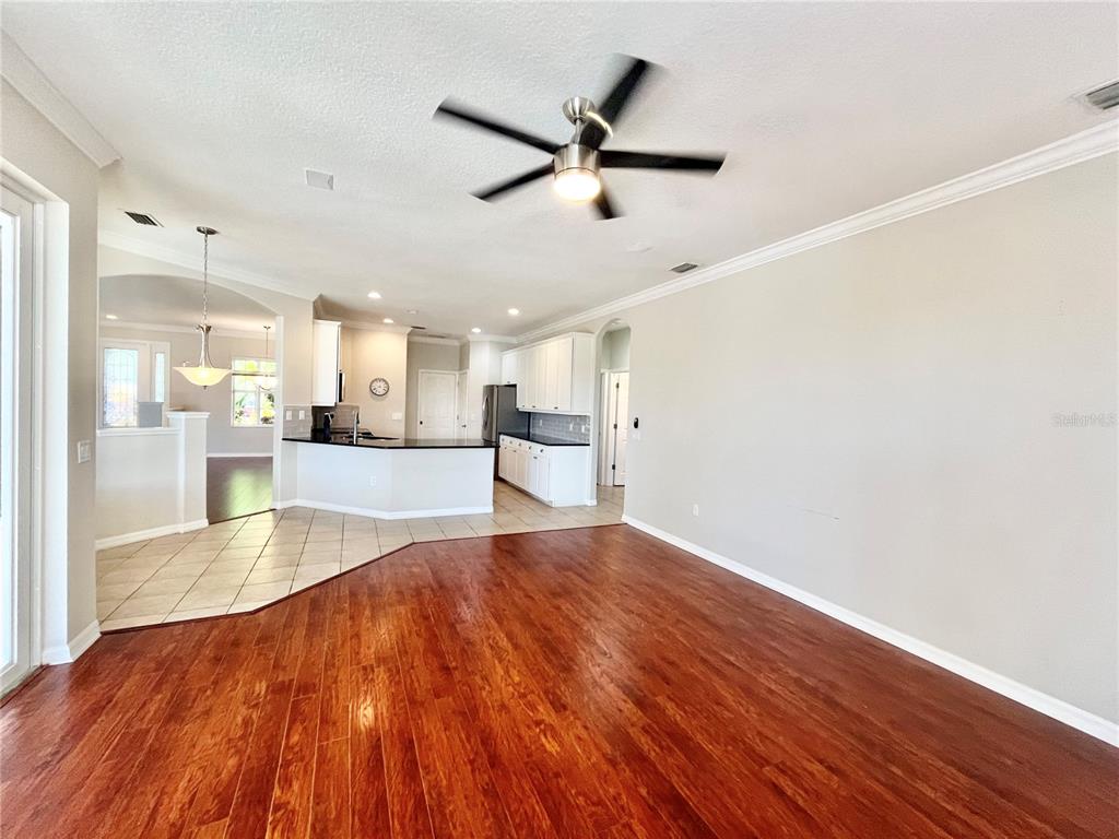 Split Bedroom Walk-In Closet(s)Ceiling Fan(s) Eating Space In Kitchen High Ceilings Living Room/Dining Room Combo Open Floorplan Solid Surface Counters Solid Wood CabinetsCrown Molding Kitchen/Family Room ComboExterior Features: