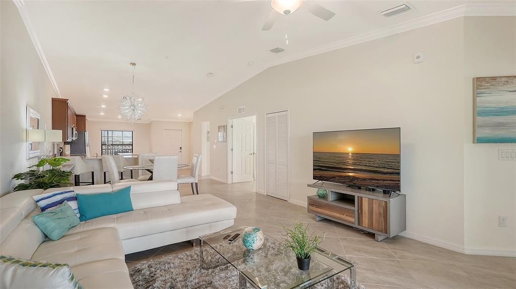 Split Bedroom Walk-In Closet(s)Ceiling Fan(s) High Ceilings Living Room/Dining Room Combo Open Floorplan Window Treatments Solid Surface Counters Kitchen/Family Room ComboEquipment/Appliances: