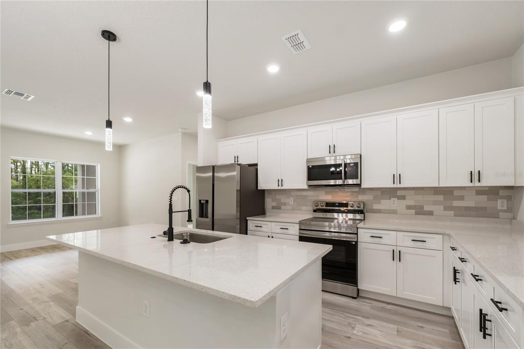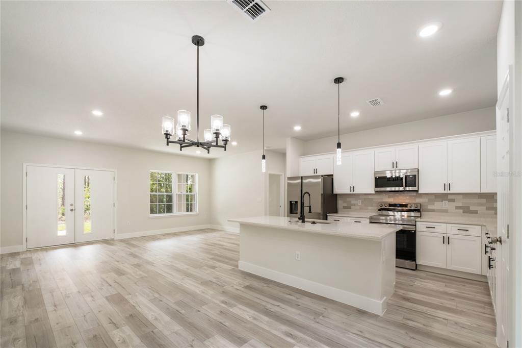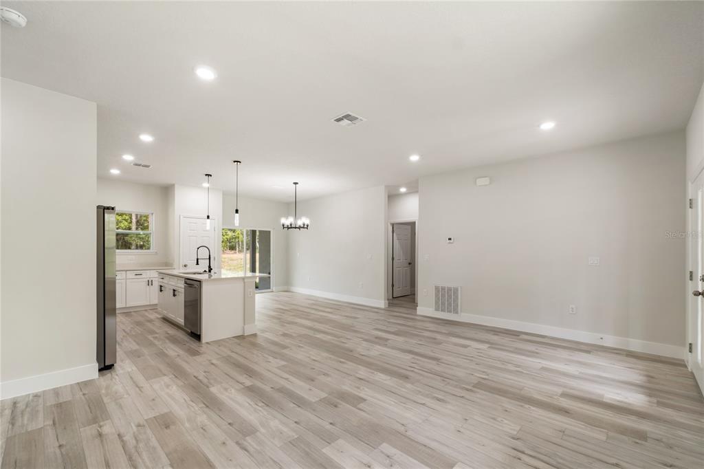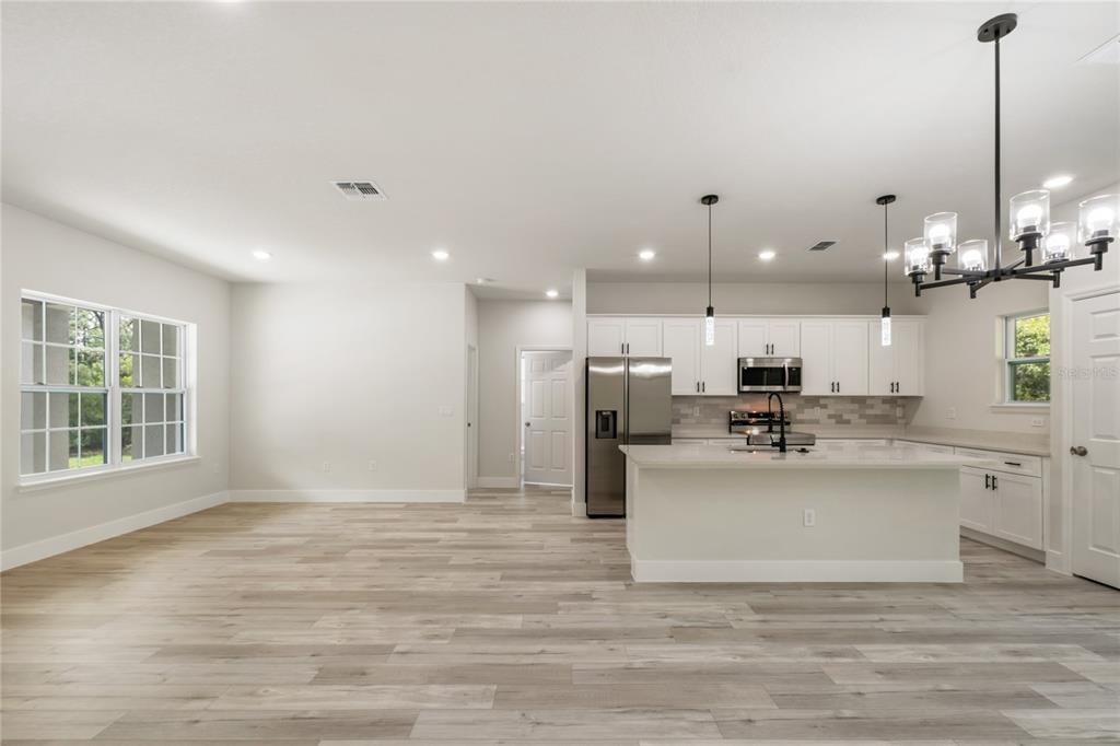 Move-in ready new build! this beautifully crafted 3-bedroom, 2-bath residence with a spacious 2-car garage offers a blend of comfort, convenience, and modern design. step through the grand double doors and into an open, airy layout ideal for both relaxation and entertaining. the kitchen and dining areas flow seamlessly into an oversized covered lanai, perfect for indoor-outdoor living. the kitchen features a sleek center island with breakfast bar, quartz countertops, stainless steel appliances, a large basin sink, and 42” upper cabinets with crown molding. a walk-in pantry adds extra convenience, while luxury vinyl plank flooring throughout enhances the home's clean, modern aesthetic. the private primary suite, located at the rear of the home, is filled with natural light and includes a large walk-in closet and an ensuite bath with dual vanities, a tiled walk-in shower, and a separate water closet. two additional bedrooms are situated on the opposite side of the home and share a full bathroom with quartz countertop and tiled tub/shower combo. additional highlights include an indoor laundry room with quartz-topped counter, stainless steel utility sink, and extra shelving for storage. enjoy your mornings on the front porch and unwind in the evenings from the privacy of the expansive covered lanai. this thoughtfully designed home is ready for you—schedule your private showing today!10075 N CONRAD, CITRUS SPRINGS, FL 34434