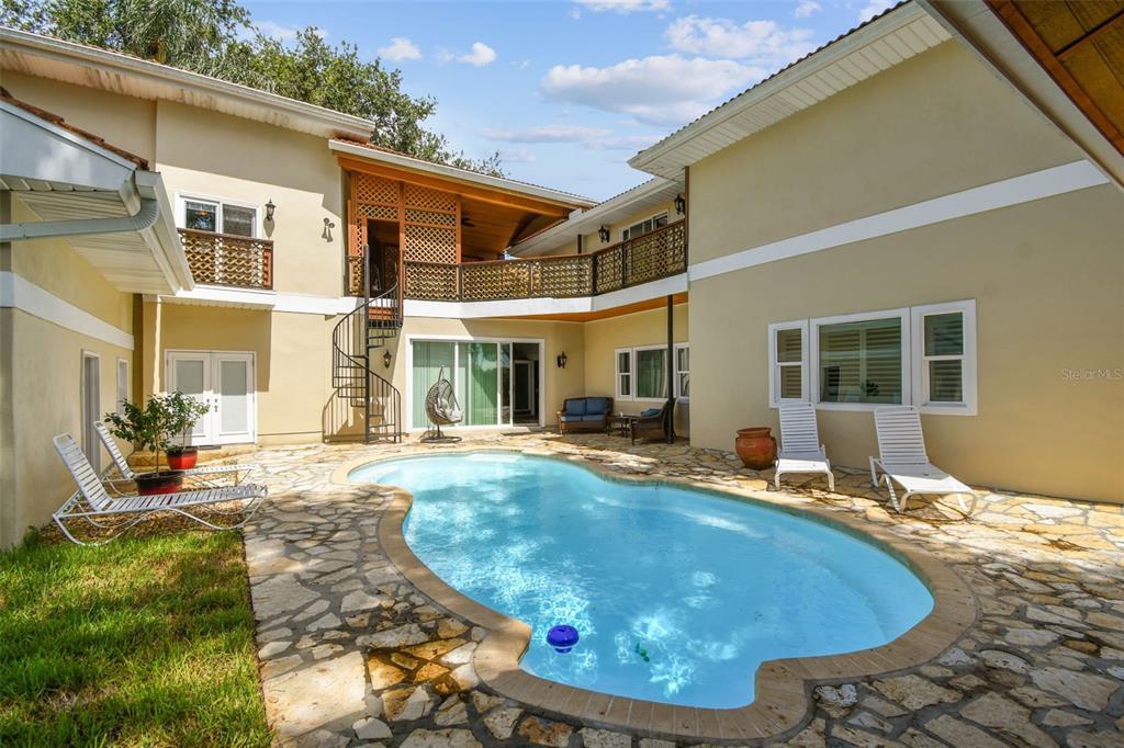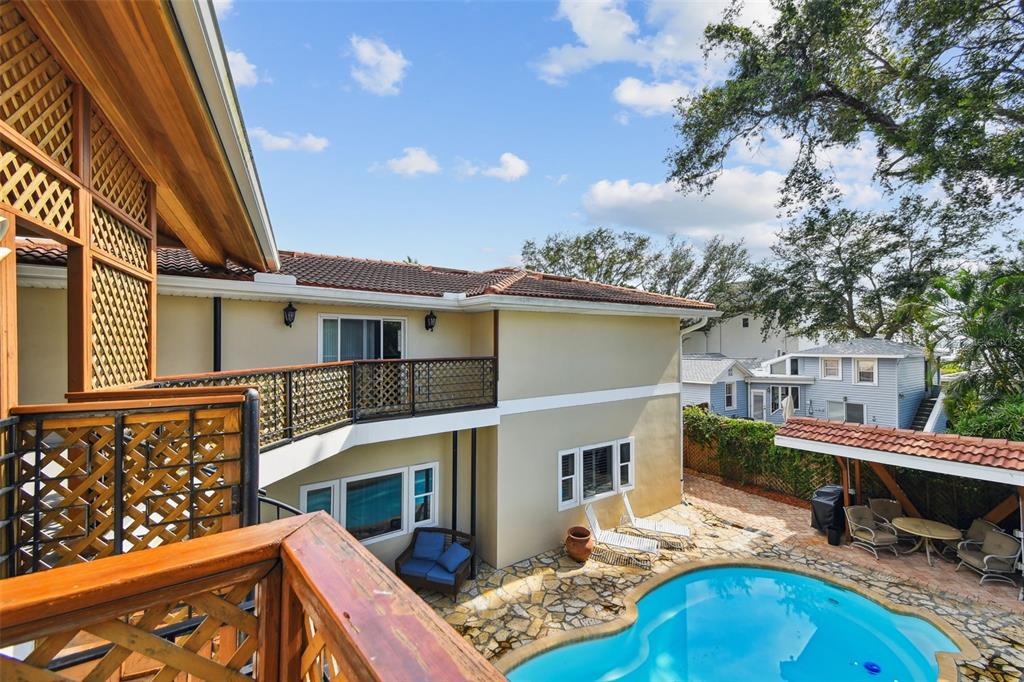 Welcome to your private compound in a prime clearwater/dunedin location just one block from the gulf of mexico with peek-a-boo water views from the top deck. this sprawling 6-bedroom, 6-bath estate is a rare gem designed for luxurious living and effortless entertaining. the main home offers four spacious bedrooms and four baths. a custom solid mahogany front door opens to a light-filled interior featuring imported italian porcelain tile, elegant crown molding, and tray ceilings. triple sliding doors lead to a cozy fireplace room, seamlessly connecting indoor and outdoor living. the kitchen includes solid wood cabinetry, granite countertops, bar seating, and two large pantries, flowing easily into the formal dining room for dinners or game nights at the table. enjoy movie nights or the big game in the bar room with theater seating. you will enjoy entertaining around the custom-built bar, crafted from antique brick dating back to the 1800s and topped with warm cypress wood, complete with a fridge, wet bar, and surround sound. two en-suite bedrooms, an additional guest bedroom and guest bath finish out the main house first floor. the main house second floor is reserved exclusively for the primary suite. the primary suite is supremely spacious and private with high ceilings and a huge closet, you will enjoy the luxuries of space, storage and natural light with direct access to the upper deck, the perfect place to enjoy a peaceful evening drink while overlooking the gulf under the stars. step outside to your personal resort. the saltwater fiberglass pool—refurbished just two years ago—is nine feet deep and set within a texas ripple stone deck, with an upgraded biofilter system and an outdoor area ready to become your future outdoor kitchen. a lush grassy area for pets, private outdoor storage, and wrap-around cedar ceiling deck with spiral staircase complete the outdoor experience. in addition to the main home, a detached two-story guest house adds incredible flexibility. it features one bedroom, one full bath, and a full kitchen—ideal for extended family, guests, or income potential with minimum one-month rentals allowed. a detached gym or studio adds even more versatility, featuring air conditioning, a full bathroom, on-demand water heater, and stackable washer and dryer. engineered for gulf coast living, the home is equipped with hurricane-rated windows, four in-ground electric subpanels, a french drain system in the backyard and storm-conscious upgrades to provide safety and security through every season. enjoy peace of mind with a carrier hvac system with a coastal guarantee that’s just four years old, and a concrete tile roof, jet ski and kayak parking, and no hoa. a two-car garage offers additional storage and a laundry area, making this property as practical as it is luxurious. thoughtfully designed and meticulously maintained, this one-of-a-kind home delivers privacy, character, and unparalleled entertainment potential just steps from the gulf and only 5 minutes from downtown dunedin. sunset walks along edgewater drive trail are just steps away or walk a block into the neighborhood to charles park. dunedin is known for its walkable downtown, waterfront parks, local boutiques, breweries, and vibrant community events. locals enjoy top-rated beaches like honeymoon and caladesi islands, plus the scenic pinellas trail for biking and being active.1020 CHARLES, CLEARWATER, FL 33755