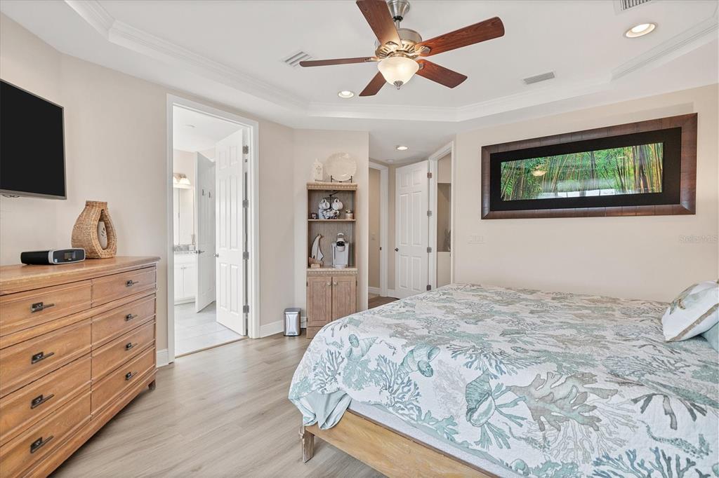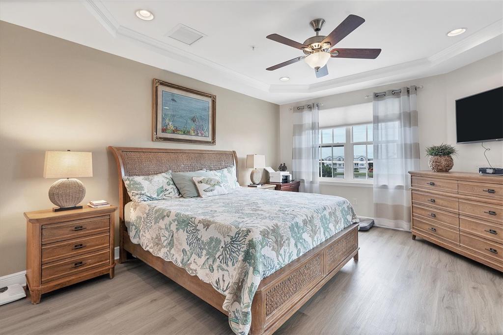 from here you can again take the stairs or elevator to the top floor which features two master suites so take your pick. one faces the southern part of the complex and the other faces to the north. both bathrooms feature the same custom leather granite that is in the kitchen and dual vanities. the suites both have large walk-in closets. this whole level has luxury vinyl throughout, replacing the old carpet.