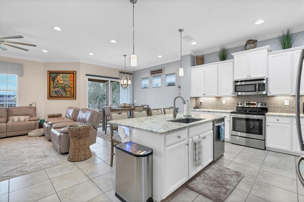 let’s look at the kitchen!! i'm not sure you'll want to cook in it because of how beautiful it is. if you do choose to get it dirty it has everything your inner food network star needs to create gourmet delights for everyone to enjoy. the first thing you will probably notice are the one-of-a-kind leather granite countertops and how much space they offer. they are showstoppers. then you'll notice the large island and plethora of cabinets. next might be the stainless appliance package. finally, is the glass back splash that finishes off this exquisite space.