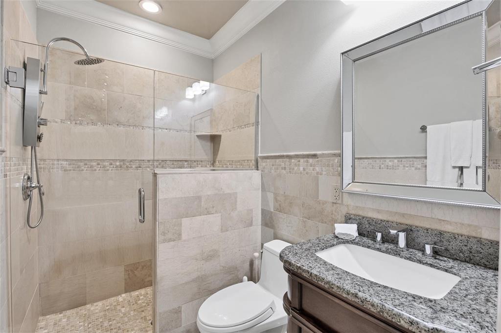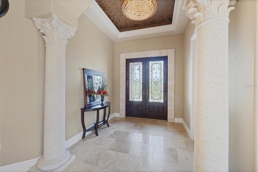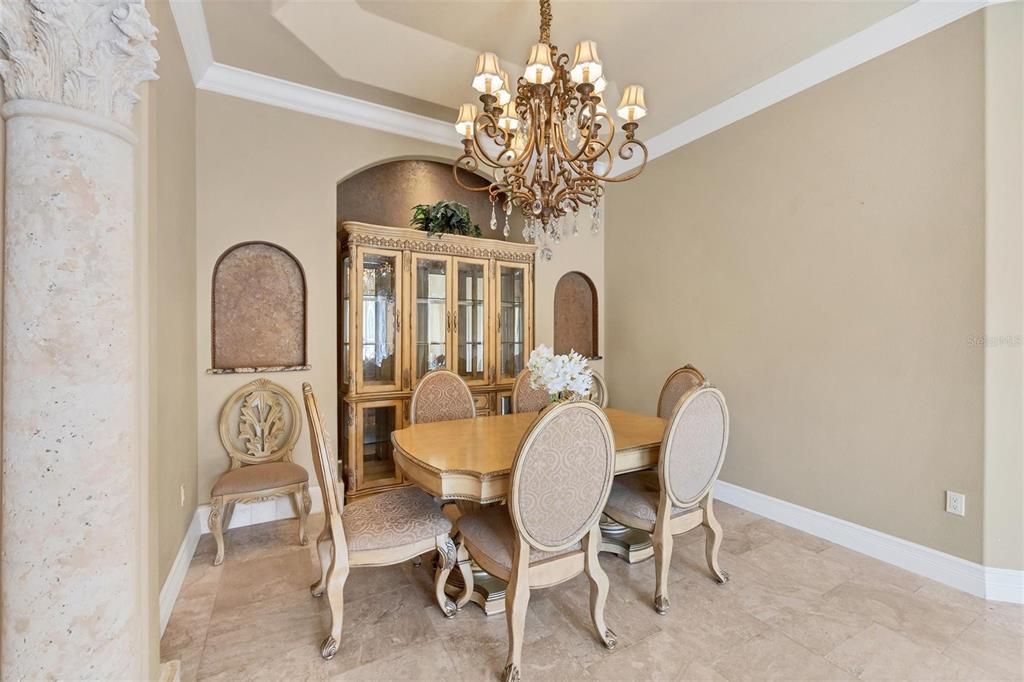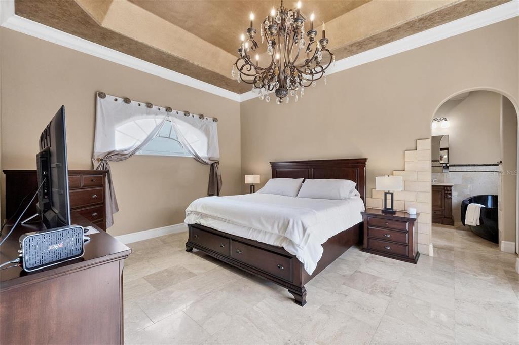 Split BedroomBuilt-in FeaturesCeiling Fan(s) Eating Space In Kitchen High Ceilings Window Treatments Solid Surface CountersCrown Molding Primary Bedroom Main Floor Tray Ceiling(s) Central VacuumExterior Features: