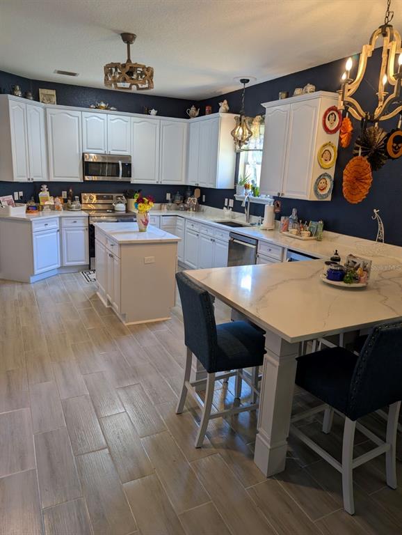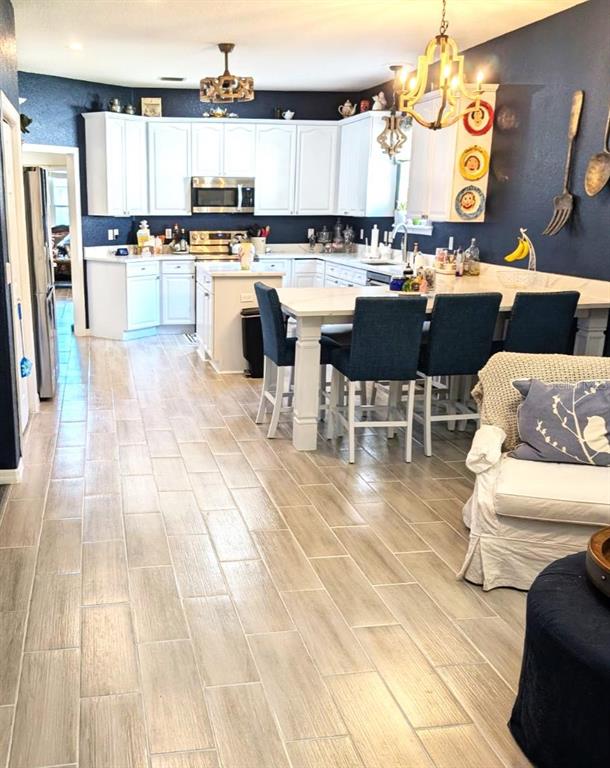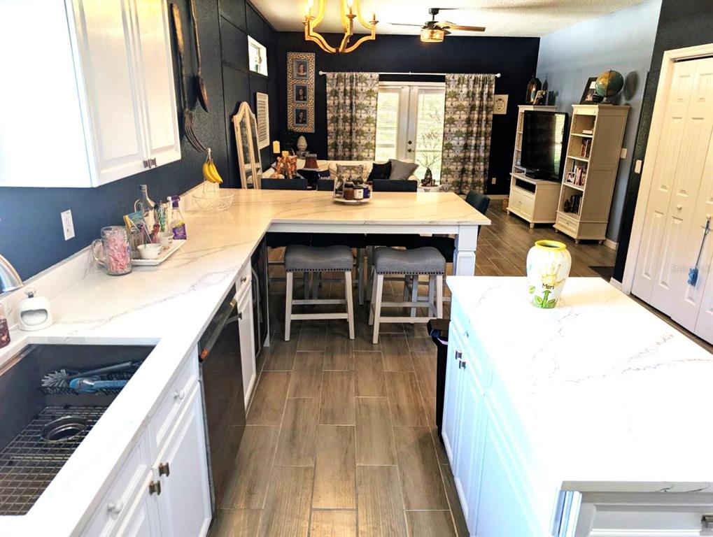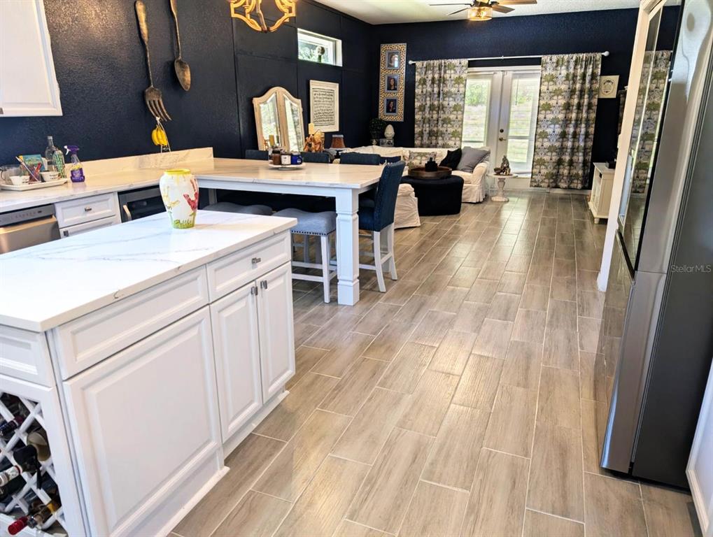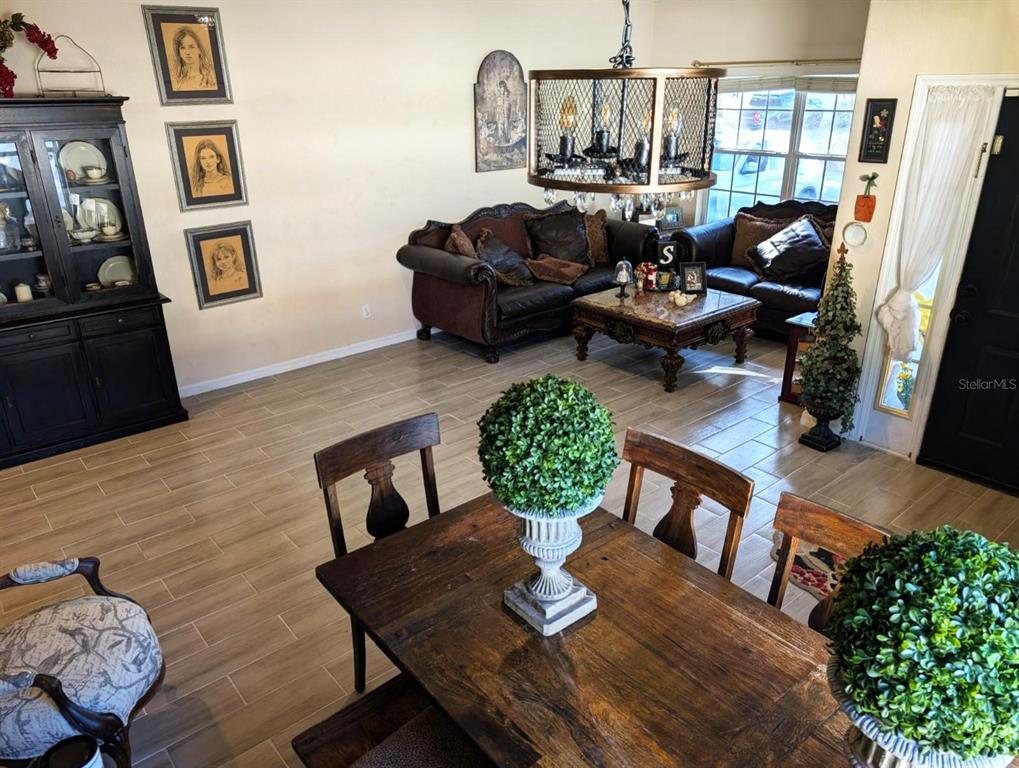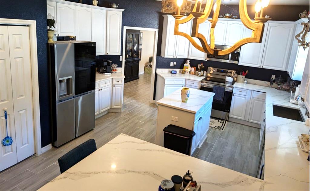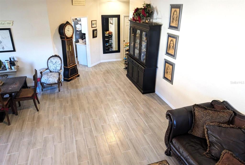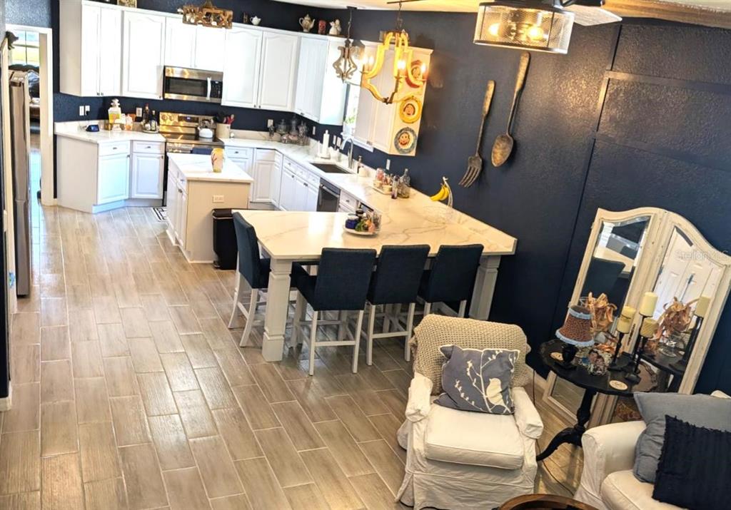 Come tour this well appointed single-story home, located on a canopy lined street in the picturesque community of palisades. this home offers open living areas for easy entertaining. upon entering the home, you will find new gray wood-look ceramic tile that flows throughout the main living areas. an open dining room/living room combination offers ample space to host family gatherings or parties with friends. directly behind the formal living area is the recently updated kitchen. this room features a completely new stainless steel appliance package, refaced wood cabinets, new kraus sink and trash compactor as well as a custom designed quartz countertop featuring a large peninsula to enjoy meals. any chef would be pleased with the double door pantry, and plenty of counterspace for meal prep. partake in an evening libation to relax? this kitchen has two storage options for your wine collection. the island features a wine rack and directly behind it, you will find a wine refrigerator. the main refrigerator features a craft ice maker for your high-ball drinks.the great room flows directly onto a screened lanai where you can enjoy the beautiful florida weather. dine”al fresco” in the comfort of this space or curl up with a book. the owner’s retreat sits off the back of the house as well, and has its own private door to access the screened lanai. this primary bath offers a spa like bathroom with a walk-in shower and garden tub. are you a shopper? no need to worry about your shoe collection, the owner’s retreat also features and oversized walk-in closet! most light fixtures throughout the home have been updated. the guest bath has new wallpaper and fixtures that have been added to give it a custom look. ac unit is 3 years old. this home is conveniently located close to florida theme parks, golf courses, shopping, and restaurants. schedule your appointment today to see this charming home.10617 MASTERS, CLERMONT, FL 34711