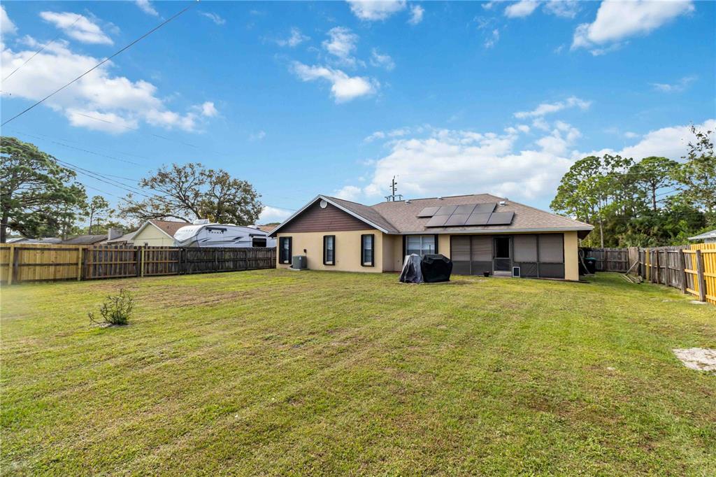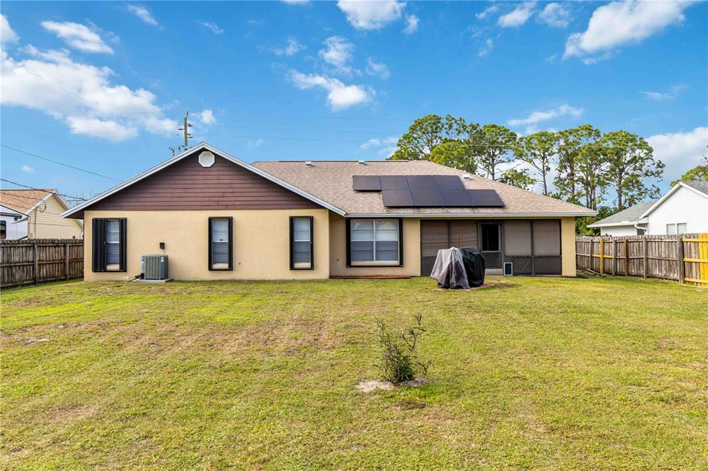 Welcome to your new home sweet home! this beautiful home has it all—recently installed solar panels transferable to a qualified buyer, making it energy-efficient and cost-saving. new roof installed in 2020! step into the updated kitchen with granite countertops, stainless steel appliances, a 29-cubic-foot refrigerator, bosch dishwasher, kohler fixtures, and plenty of cabinet space overlooking the dining area. throughout the home, enjoy 12-inch porcelain tile, 5 1/4-inch baseboards, and hunter fans. bathrooms are upgraded with stone tile showers, and a rheem water heater ensures year-round comfort. outside, the screened patio offers a relaxing view of the expansive backyard on over 1/3 of an acre, with space for a pool and outdoor entertainment. don't miss this florida retreat—schedule your private showing today! one year warranty included with purchase! solar panel info in attachments **1063 LAMPLIGHTER NW, PALM BAY, FL 32907