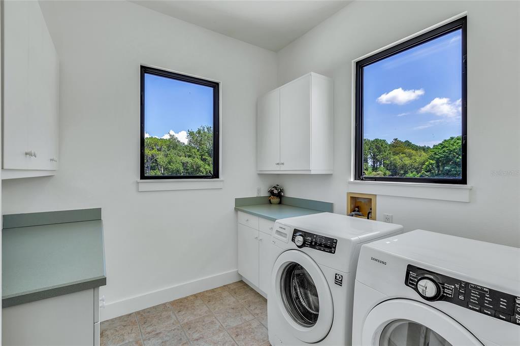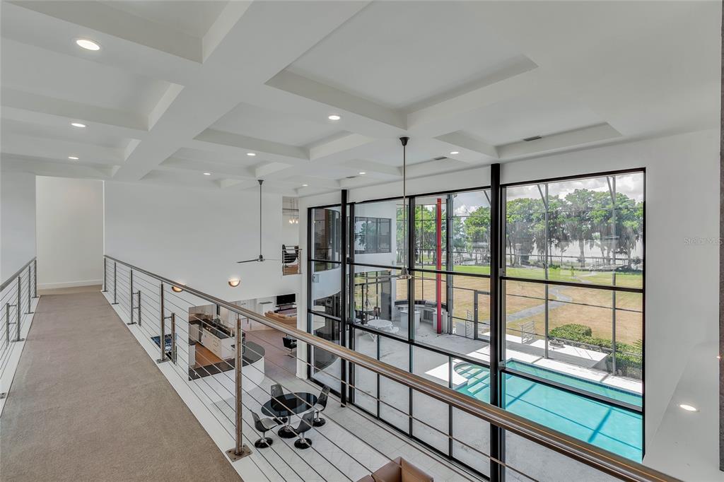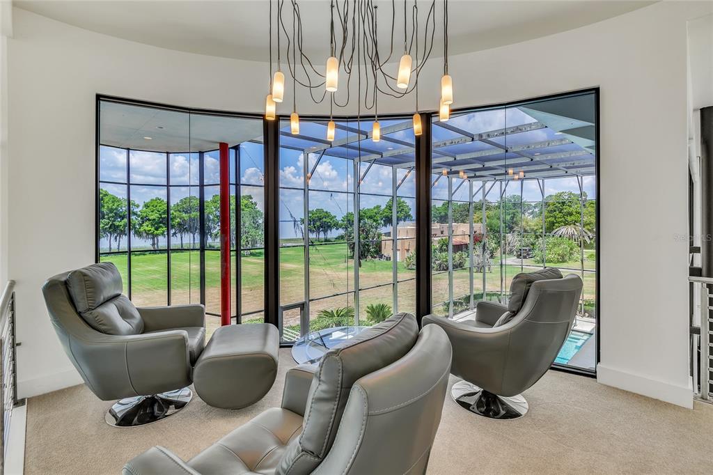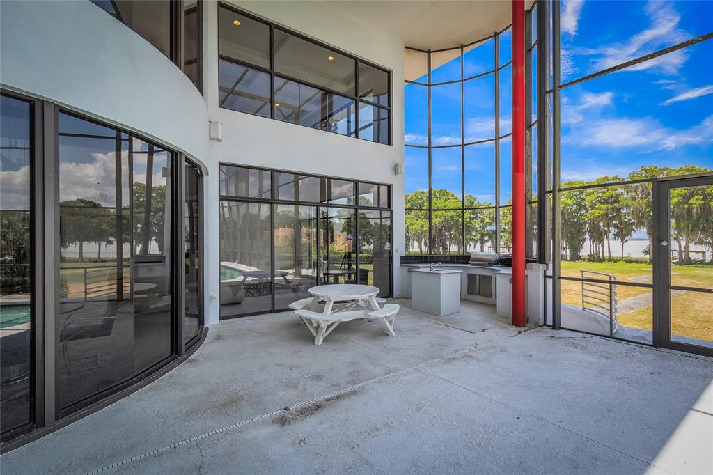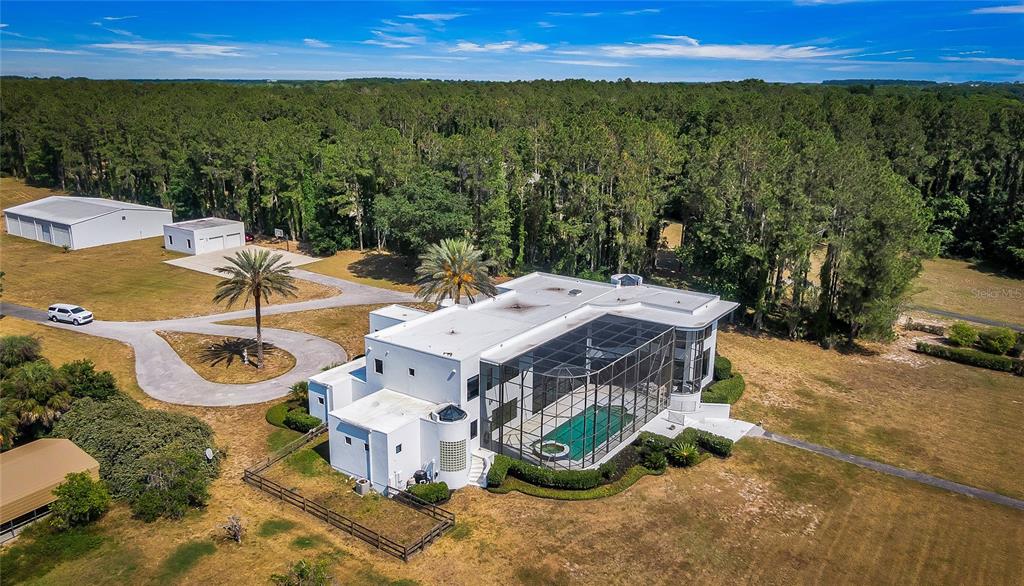Welcome to this absolutely one-of-a-kind gated lakefront estate on lake harris and the harris chain of lakes, a true architectural marvel that blends luxurious living with modern design across a sprawling 7,200 square foot custom-built home. set on a gated 6.42-acre lot with no hoa, this property is a once-in-a-lifetime opportunity, offering complete privacy, breathtaking sunset views on the lake, and a private dock. from the moment you walk down the descending walkway into the dynamic great room, you're greeted by a 25-foot coffered ceiling, a cozy gas fireplace, and bold walls of glass that showcase the spectacular views. the main level is designed for luxury and convenience, featuring a large center island kitchen, a breakfast room, a family room with an expansive glass overlook to the waterfront, and a home theater equipped with a 9-foot custom stewart screen and plus theater recliners. the luxurious master suite boasts a dramatic lighted ceiling, a circular glass block shower with a custom skylight, and a spacious walk-in closet. upstairs, accessible by an ultra-wide center staircase or a custom steel spiral staircase, you'll find elevated walkways offering stunning views over the great room and out to the scenic grounds and lake harris. this level includes three additional bedrooms with walk-in closets, three full bathrooms, a 4-bed bunk room, and a glass-enclosed reading loft next to a built-in 24-foot library bookcase. the estate is an entertainer's dream with a screen-enclosed heated pool and spa, a summer kitchen, and a massive 60x80 pre-engineered red iron building perfect for storing collector cars, rvs, boats, or as a horse barn. this building is fully hurricane rated and features a 10-inch reinforced concrete floor strong enough for the heaviest equipment. with additional amenities like a three-car attached garage, a two-car detached garage, and two laundry rooms—one on each floor—this property doesn’t just promise a home but a new way of experiencing life by the water's edge. whether you’re hosting grand scale events or seeking tranquility, this estate offers it all.11106 LANE PARK, TAVARES, FL 32778