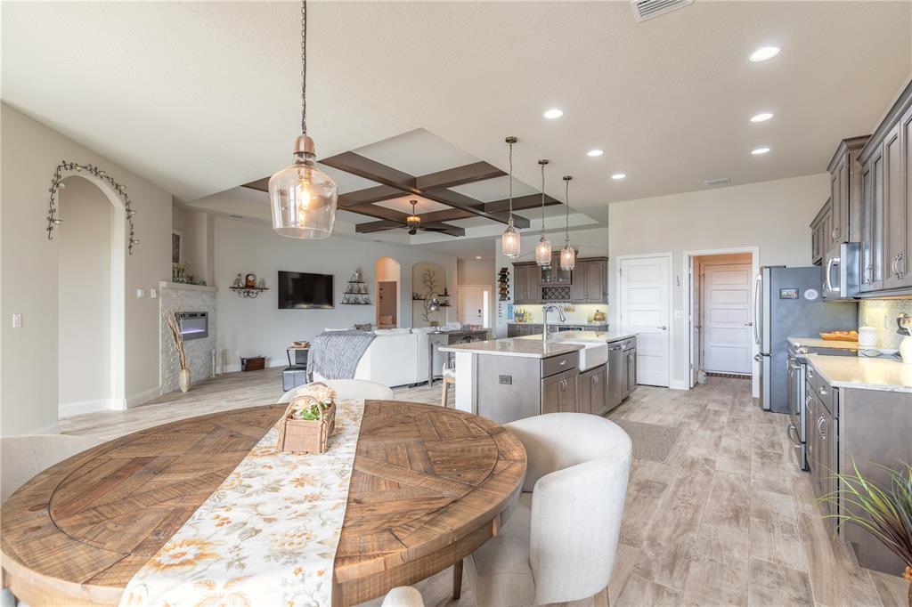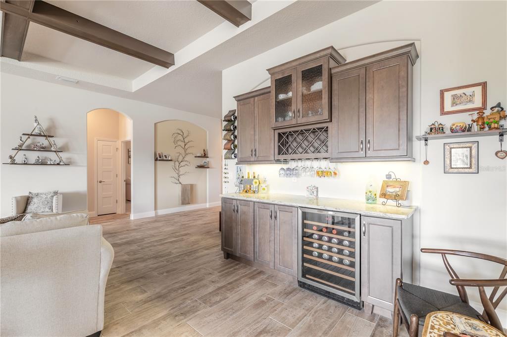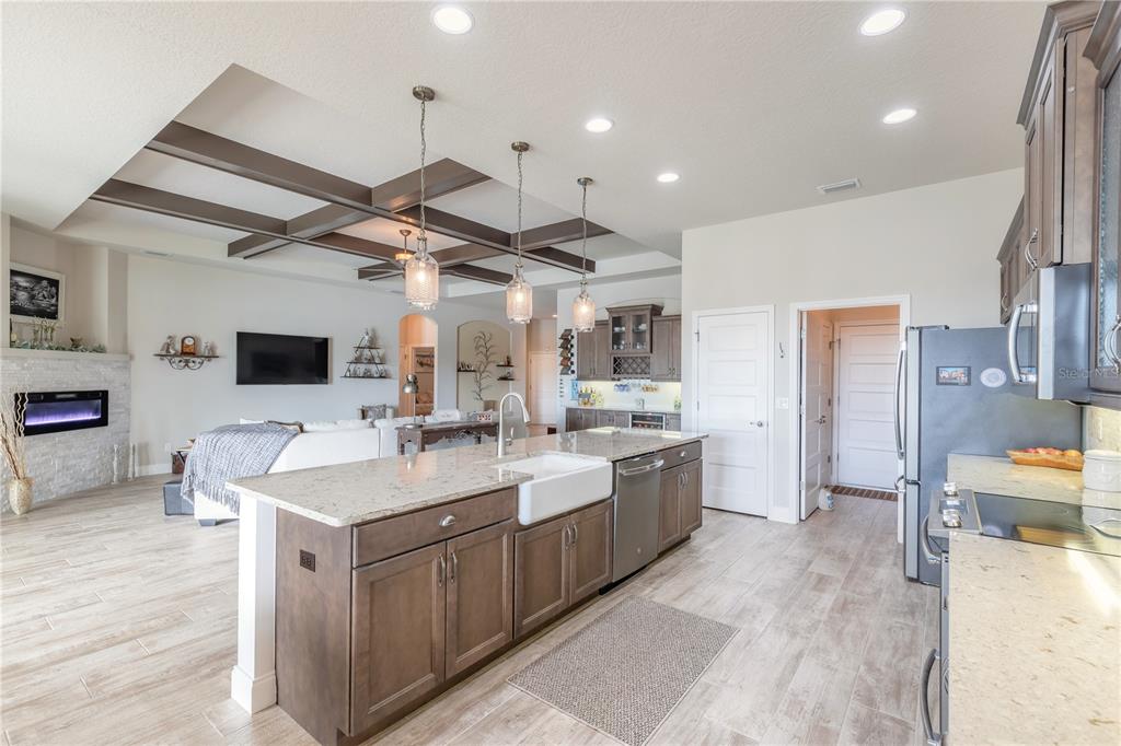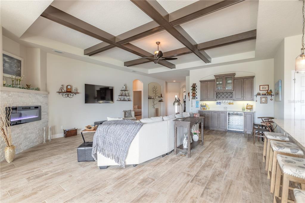 Wet Bar Walk-In Closet(s)Ceiling Fan(s) High Ceilings Thermostat Open Floorplan Window Treatments Solid Surface Counters Primary Bedroom Main Floor Kitchen/Family Room Combo Coffered Ceiling(s) Chair RailExterior Features: