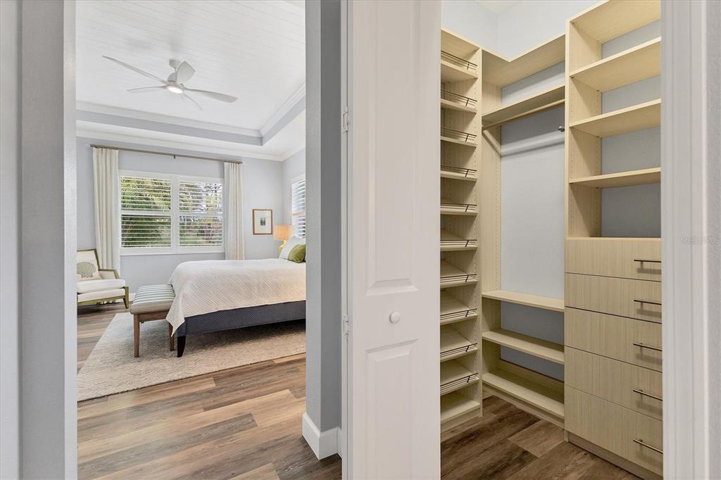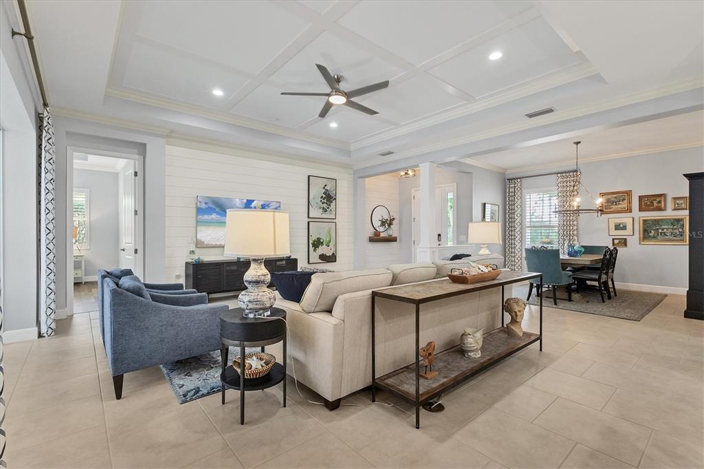 Walk-In Closet(s)Ceiling Fan(s) High Ceilings Stone Counters Thermostat Open Floorplan Window Treatments Solid Surface CountersCrown Molding Primary Bedroom Main Floor Kitchen/Family Room Combo Coffered Ceiling(s) L DiningExterior Features: