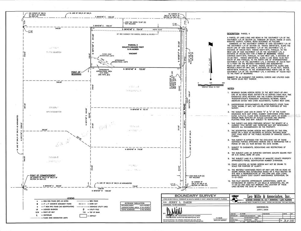 DESCRIPTION: PARCEL 1 A PARCEL OFLAND LYING AND BEING IN THE SOUTHWEST 1/4 OF THE SOUTHWEST 1/4 OF SECTION 24, TOWNSHIP 36 SOUTH, RANGE 21 EAST, MANATEE COUNTY, FLORIDA, BEING DESCRIBED AS FOLLOWS: COMMENCE AT THE SOUTHWEST CORNER OF SAID SOUTHWEST 1/4 OF THE SOUTHWEST 1/4 OF SECTION 24; THENCE S89°50'26"E, ALONG THE SOUTH LINE OF SAID SOUTHWEST 1/4 OF THE SOUTHWEST 1/4, ADISTANCE OF 540.00 FEET FORA POINT OF BEGINNING; THENCE N00°11'35"E, PARALLEL TO THE WEST LINE OF SAID SOUTHWEST 1/4 OF THE SOUTHWEST 1/4, ADISTANCE OF 314.50 FEET; THENCE S89°45'48"E, PARALLEL TO THE NORTH LINE OF SAID SOUTHWEST 1/4 OF THE SOUTHWEST 1/4, ADISTANCE OF 719.58 FEET TO APOINT ON THE WESTERLY MAINTAINED AND MONUMENTED RIGHT-OF-WAY LINE OF MJ ROAD; THENCE S00°28'17"W, ALONG SAID WESTERLY RIGHT-OF-WAYLINE, ADISTANCE OF 313.53 FEET TO A POINT ON THE AFOREMENTIONED SOUTH LINE OF THE SOUTHWEST 1/4 OF THE SOUTHWEST 1/4; THENCE N89°50'26"W, ALONG SAID SOUTHLINE, ADISTANCE OFTax Year: