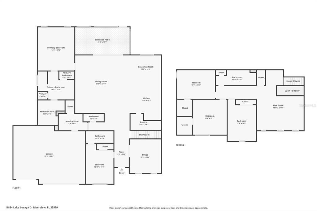 One or more photo(s) has been virtually staged. spacious & elegant 5-bedroom home in gated lake lucaya club – move-in ready! 5 bedrooms with junior suite + home office + bonus loft welcome to your dream home in the highly sought-after lake lucaya club! this stunning 5-bedroom, 3.5-bathroom, 3-car garage home offers an impressive 3,451 square feet of thoughtfully designed living space. from the moment you arrive, you’ll be captivated by the gorgeous tropical palm trees swaying in the breeze, enhancing the home’s pavered driveway and adding to its curb appeal. a striking red front door and elegant archways set the stage for the beauty that awaits inside. bright and open living area, where natural light fills the space with large windows and creates a warm and welcoming ambiance. the great room seamlessly flows into the gourmet kitchen, making it an entertainer’s dream! featuring granite countertops, a gas stove, stainless steel appliances, large pantry and an extended island, this kitchen is designed for both functionality and style—perfect for meal prep, casual dining, or hosting guests. the first-floor primary suite is a serene retreat, offering a spacious bedroom, a huge walk-in closet, and a luxurious en-suite bath with dual sinks and a large walk-in shower. a junior suite is also conveniently located on the first floor, making it an ideal in-law suite or private guest retreat. need a quiet workspace? the elegant home office with french doors provides the perfect environment for remote work or creative projects. upstairs, a large bonus loft offers additional flexible living space, perfect for a media room, playroom, or second lounge area. the three generously sized secondary bedrooms provide ample space for family and guests, while the full secondary bathroom boasts extended counter space, making morning routines effortless. the extended screened lanai, complete with dual ceiling fans, offers a peaceful place to unwind or entertain. the fully fenced backyard and paver patio provide plenty of space for outdoor gatherings—just fire up the grill and invite friends and family over! this home is packed with modern upgrades, including two ac systems for optimal comfort, a water softener, a wifi-connected sprinkler system, and an on-demand tankless gas water heater. located in the gated lake lucaya club, this community is known for its resort-style amenities, including a sparkling pool, a fishing pier overlooking the lake, a fitness center, a clubhouse, and a packed social calendar filled with community events. whether you prefer lounging by the pool, fishing off the pier, or mingling with neighbors at events, there’s something for everyone in this vibrant community. situated in the fast-growing south shore area, you’ll enjoy easy access to schools, shopping, dining, and major highways, making commuting and daily errands a breeze. don’t miss out on this exceptional home! schedule your private showing today and take the first step toward making this dream home yours!11834 LK LUCAYA, RIVERVIEW, FL 33579