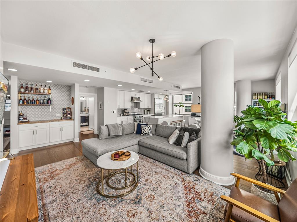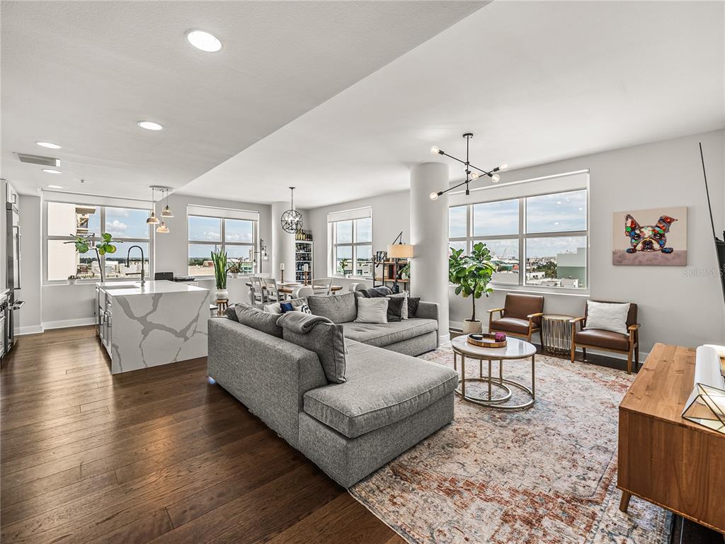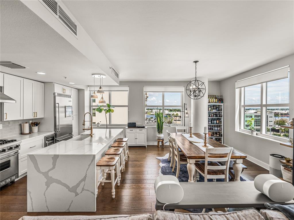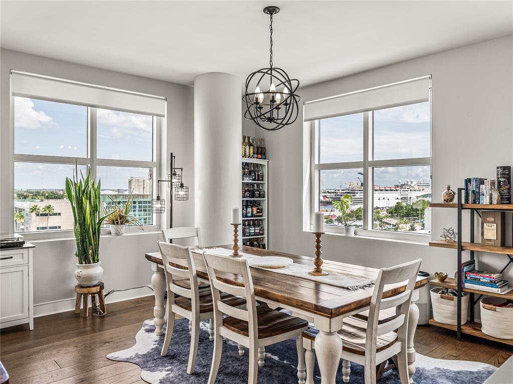 Welcome to grand central at kennedy! this beautifully renovated 2-bedroom, 2-bathroom corner unit located on a private hallway boasts 1,379 square feet of living space. from the moment you enter the home, it's clear that the owners focus is on quality and detail. the open-concept kitchen, living and dining room feature 9-foot ceilings with an abundance of large windows that flood the space with natural light. this quiet and bright unit offers incredible views of the downtown and channelside area. the updated kitchen with stunning quartz waterfall island as its centerpiece has stainless steel appliances, a wine refrigerator and 42-inch cabinets with soft close hinges and custom pull-out drawers. the home also has beautiful hardwood floors throughout, updated light fixtures and custom built-in bar which makes the space warm and inviting. the open concept floorplan is perfect for entertaining family and friends with your favorite beverage or relax with morning coffee and watch the cruise ships pass by. the bedrooms have large windows with privacy shades and walk-in closets. the primary bedroom has an ensuite bathroom and provides privacy from the rest of the home. both bathrooms have been exquisitely renovated. the primary bathroom features a large walk-in shower, vanity with double sink and beautiful extra-large floor tile creating a serene, spa-like atmosphere. the second bathroom has beautiful extra-large floor to ceiling tiles, updated vanity with stone counter and features a standalone tub. this unit also includes two conveniently located reserved parking spaces on the same floor. grand central boasts remarkable amenities on the 9th floor, including two expansive pools with hot tubs, a well-equipped fitness center and a clubhouse. there's also a dog walk area that provides breathtaking views of water street and the downtown skyline. the courtyard and surrounding area of the complex boast a diverse array of dining options, bars, coffee shops, nail salons, massage studio, crunch fitness, cvs, and publix. grand central is conveniently located to all the city's major attractions, with easy trolley access to ybor city and other downtown locations! walkable to sparkman warf, water street, tampa riverwalk, and amalie arena. discover the vibrant lifestyle of channelside and downtown tampa by making grand central your new residence.1208 E KENNEDY #734, TAMPA, FL 33602