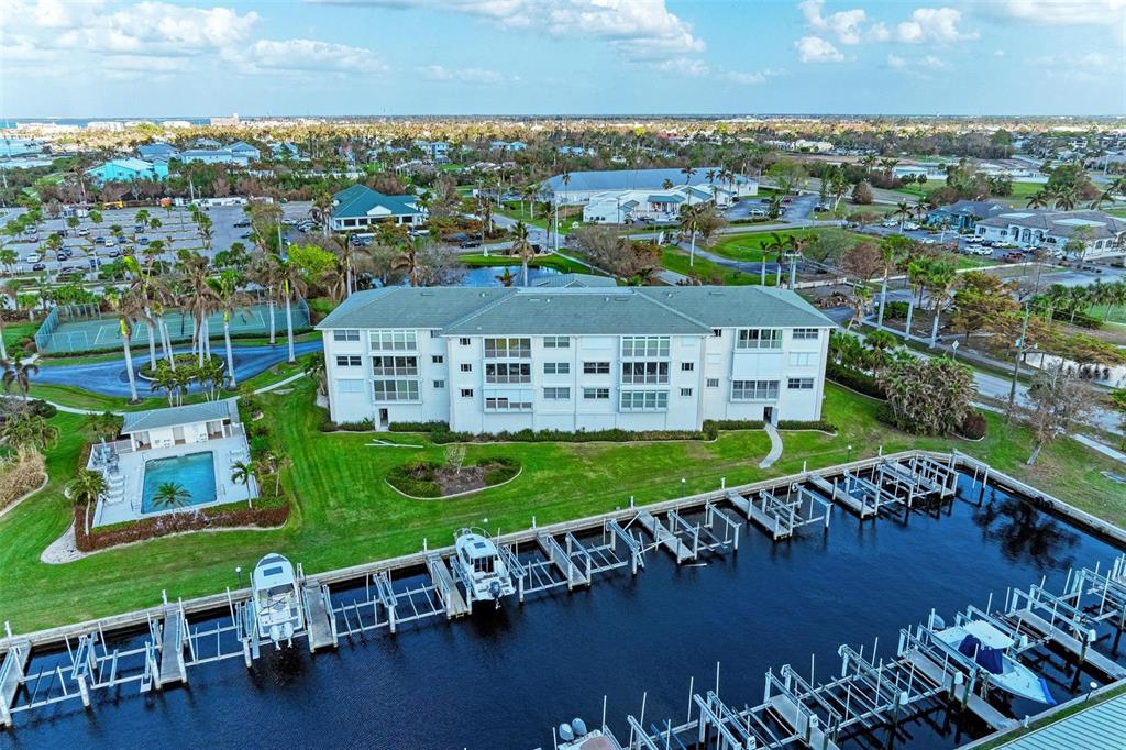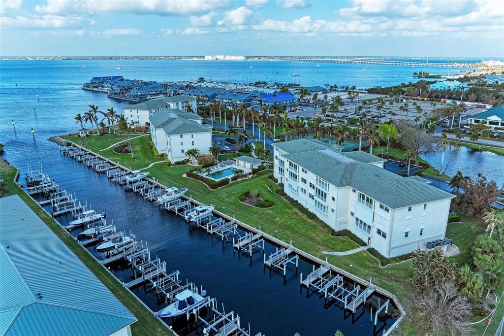 Priced to sell! incredible top floor, end unit, fully furnished waterfront condo with dock & 10,000 lb lift are ready for you! seize the opportunity to own this fabulous unit with beautiful upgrades including stone counters, updated flooring, new lighting, and more along with a stunning views of the harbor, just steps to fishermen's village and downtown punta gorda. the floor plan is ideal, so enjoy a lovely foyer that opens into a large living room with vaulted ceilings and beautiful natural light and views of the harbor. off to the right, a large laundry room with spacious pantry/storage is tucked away. farther in, the dining room and large updated kitchen with stainless steel appliances, granite counters, and a beautiful breakfast bar are open to the living room, ideal for entertaining. a separate fantastic space is the florida room with impact sliders that extends the interior living space beyond these areas, making a perfect spot for morning coffee or evening cocktails! also, off the living room, find a large den with glass french doors, which can double as a 3rd bedroom! the primary suite is gorgeous, with a spacious walk-in closet and en suite bathroom that has been totally remodeled with custom tile work, quartz counters, and new vanities. the second guest bedroom is also quite spacious and bright, and nearby to the guest bathroom with new stone counters, also conveniently located off of the living room. deeded boat dock #3 with 10,000lb lift, storage space #1 and parking space #141 in under building garage all convey with this unit, but also find ample parking for guests around the property, as well as a beautiful heated, saltwater community pool and gazebo overlooking the harbor! starboard point also has tennis and pickleball courts and private gated access to the adjoining fisherman’s village. do not miss this opportunity! schedule your showing today!be sure to click the full virtual tour links for details!1250 W MARION #141, PUNTA GORDA, FL 33950