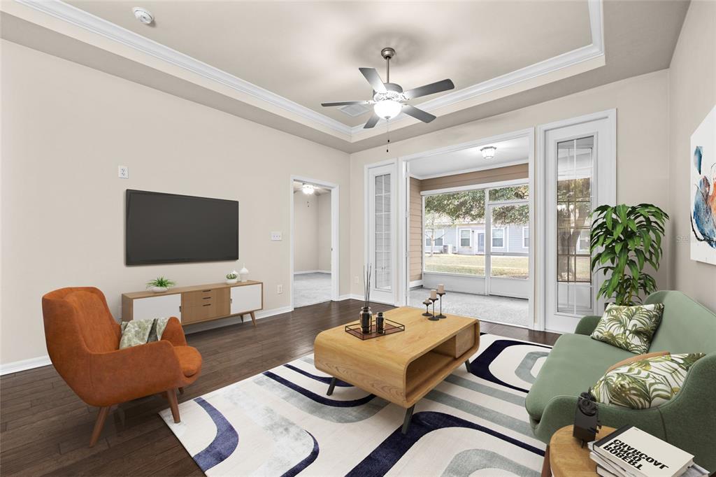 Welcome home to this turn-key 2 bedroom / 2 bathroom townhome with 1 car garage located in the villas of west end. the open floor-plan is light and bright, with the great room being highlighted by trey ceilings, crown molding and engineered hardwood flooring throughout main living area. the designated dining area flows seamlessly from great room to kitchen, boasting granite countertops, stainless steel appliances, solar tube for extra natural light, plenty of cabinetry for all your culinary needs, pantry and functional peninsula with breakfast bar for additional seating. the split floor-plan offers the primary bedroom enhanced by a trey ceiling, crown molding and large walk-in closet. stepping into the en-suite primary bathroom you’ll be greeted by a dual vanity with granite countertop and pocket door separating the glass enclosed walk-in shower area. the secondary bedroom is robust in size with wall closet and secondary full bath with large vanity and tub/shower combo. bring the outside-in when you open the french doors to the screened lanai overlooking green space. laundry room features washer/dryer with additional cabinets and 1 car garage with attic access perfect storage for all those seasonal items. hoa provides front and rear yard lawn maintenance, exterior building maintenance including roof and pest control. enjoy all the hoa has to offer at the clubhouse with weekly activities and programs, choice of 2 pools, tennis courts, pickleball courts and outdoor pavilion with dining area. located just minutes from grocery, entertainment, dining, medical and gainesville.Townhouse 2 bedrooms - VILLAS OF WEST END UNIT B PH 1 for Sale