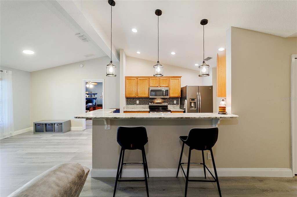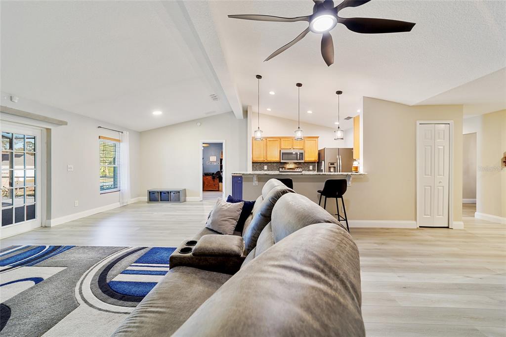 Split Bedroom Walk-In Closet(s) Vaulted Ceiling(s)Ceiling Fan(s) Eating Space In Kitchen High Ceilings Stone Counters Thermostat Open Floorplan Window Treatments Solid Wood Cabinets Primary Bedroom Main Floor Kitchen/Family Room Combo L DiningExterior Features: