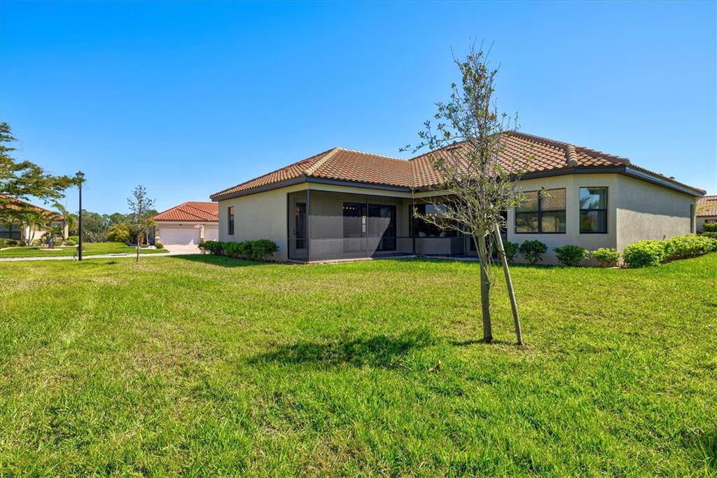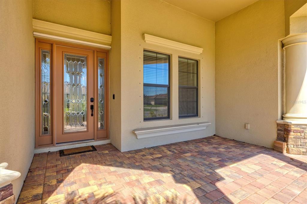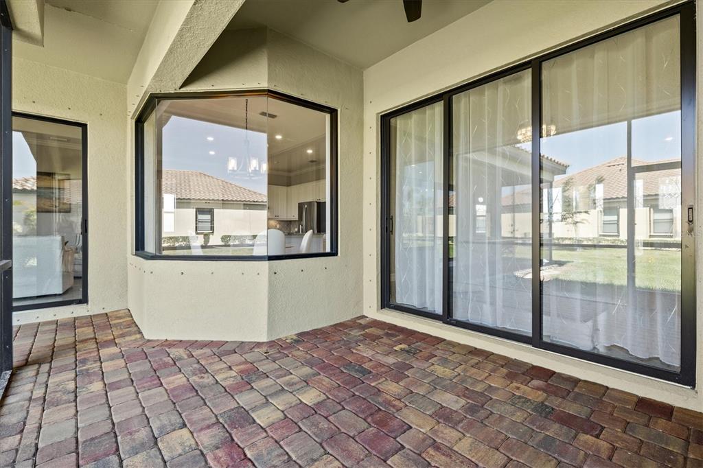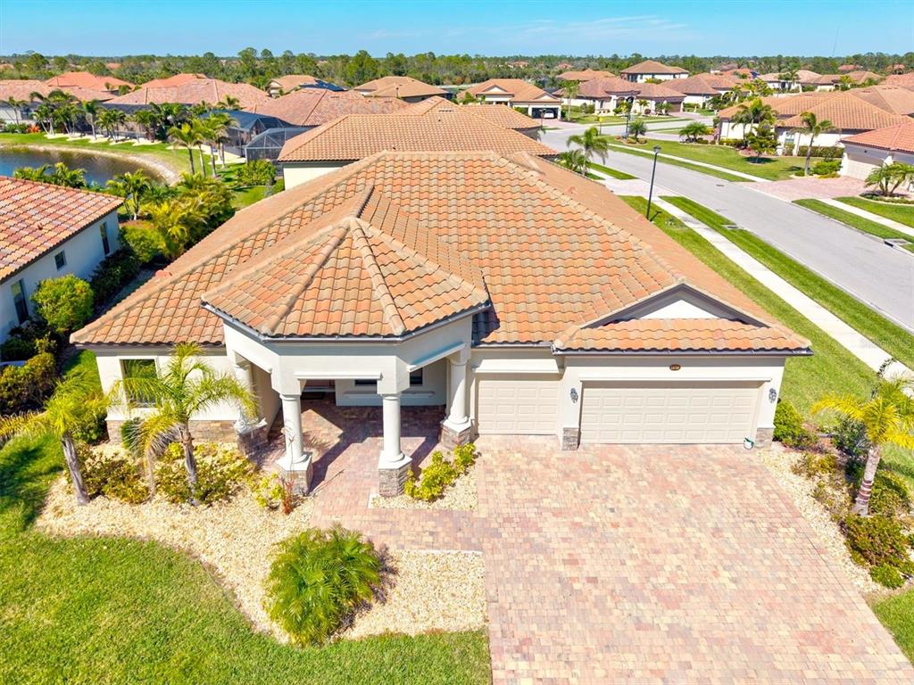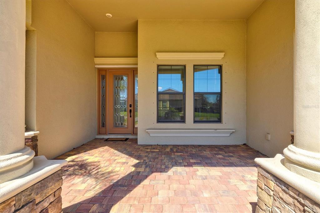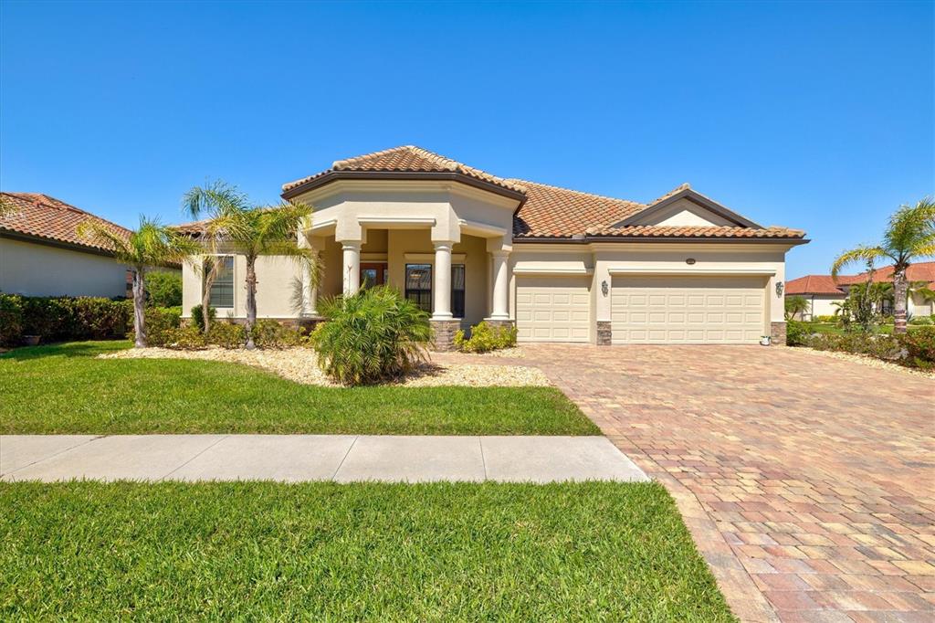 This impeccably maintained, move-in-ready estate home offers the perfect blend of luxury and relaxation within the resort-style community of gran paradiso. built in december 2020 and lightly lived in, this spacious 2,548 sq. ft. lennar "doral" floor plan is the largest one-story lennar model in the community, showcasing distinctive pillared architecture—one of only 20-25 homes of its kind.with four bedrooms and three bathrooms, this home is designed for both comfort and style. upscale finishes such as tray ceilings, crown molding, and low-maintenance tile flooring throughout enhance its elegant appeal. the bright white kitchen and bathroom cabinetry, paired with neutral tones, create a timeless aesthetic. the kitchen features ge profile stainless steel appliances, including a refrigerator with a built-in coffee maker, while the home is fully equipped with digital "smart" technology for modern convenience.