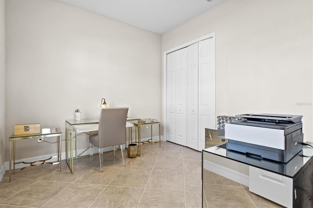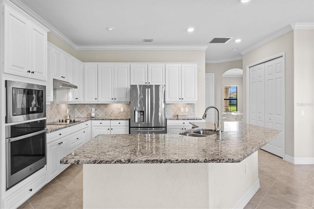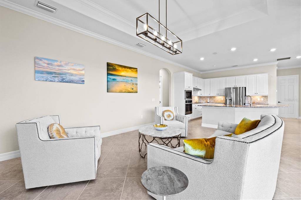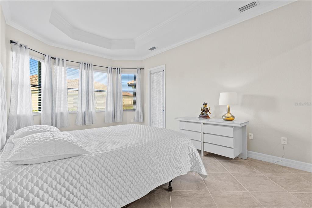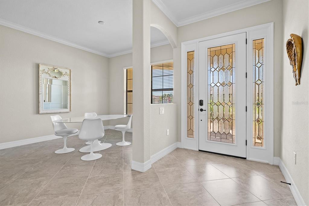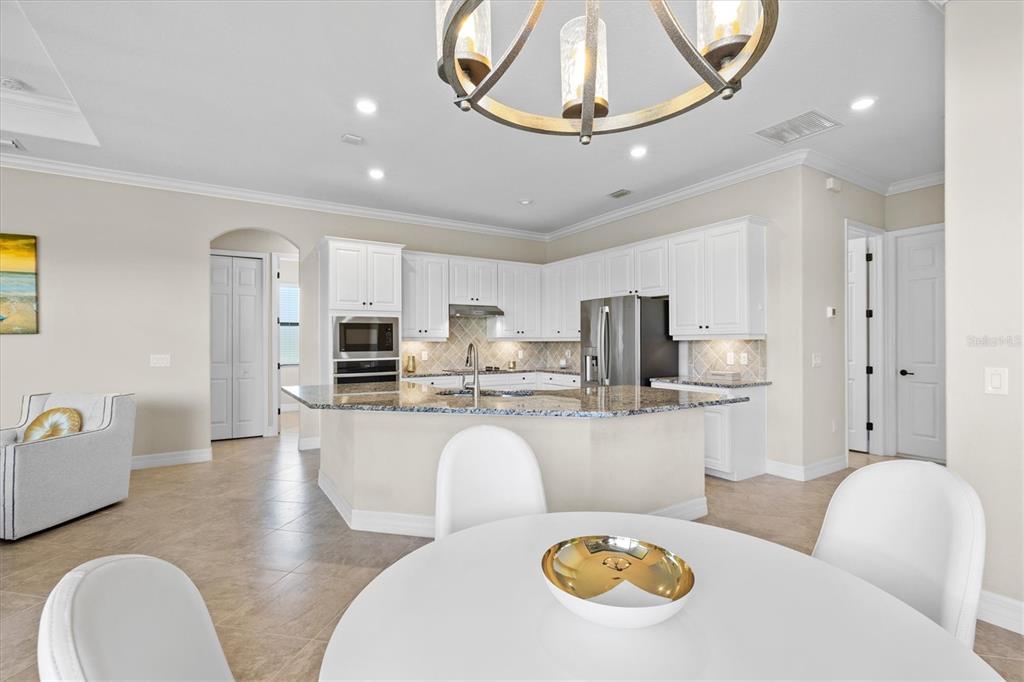 This impeccably maintained, move-in-ready estate home offers the perfect blend of luxury and relaxation within the resort-style community of gran paradiso. built in december 2020 and lightly lived in, this spacious 2,548 sq. ft. lennar "doral" floor plan is the largest one-story lennar model in the community, showcasing distinctive pillared architecture—one of only 20-25 homes of its kind.with four bedrooms and three bathrooms, this home is designed for both comfort and style. upscale finishes such as tray ceilings, crown molding, and low-maintenance tile flooring throughout enhance its elegant appeal. the bright white kitchen and bathroom cabinetry, paired with neutral tones, create a timeless aesthetic. the kitchen features ge profile stainless steel appliances, including a refrigerator with a built-in coffee maker, while the home is fully equipped with digital "smart" technology for modern convenience.