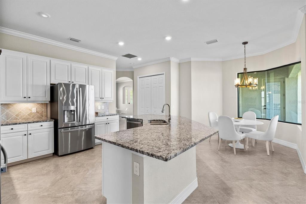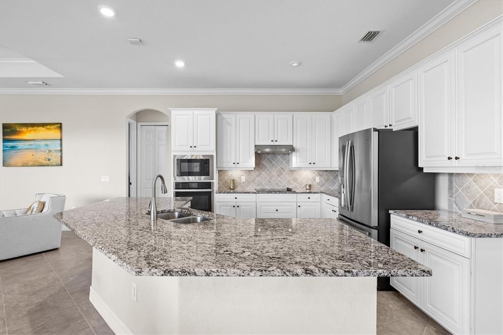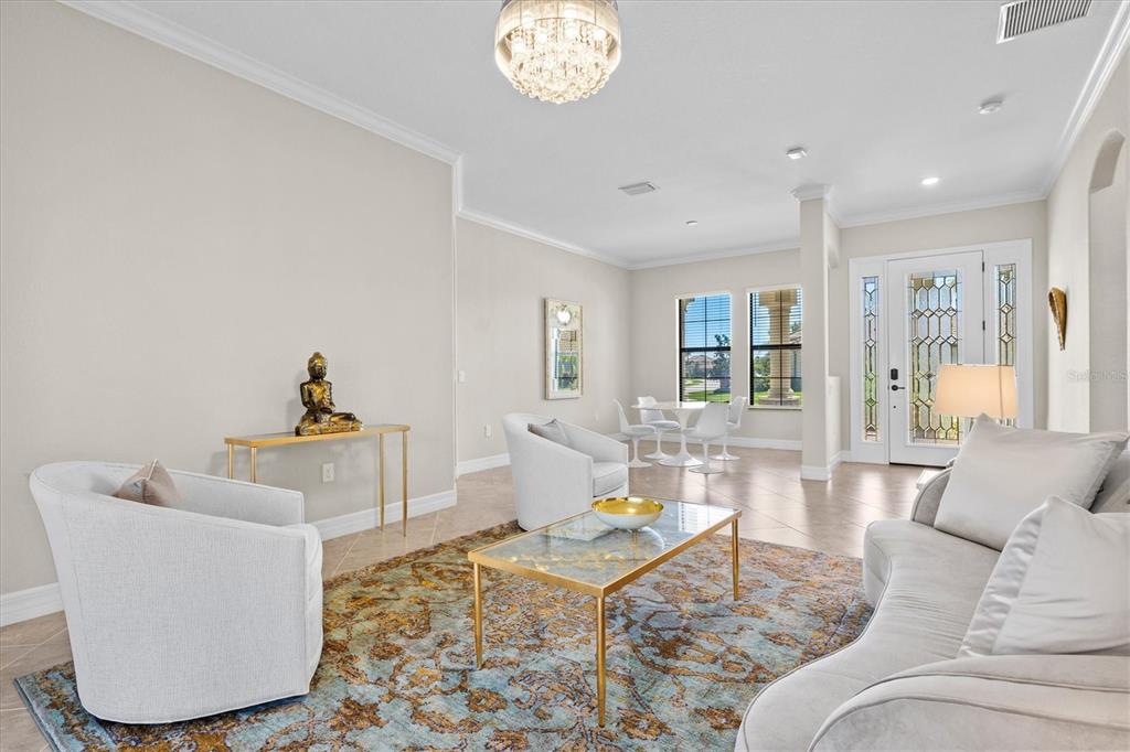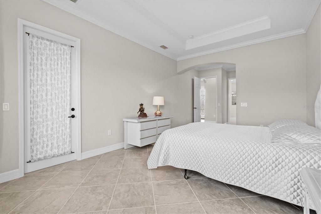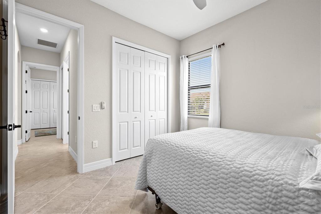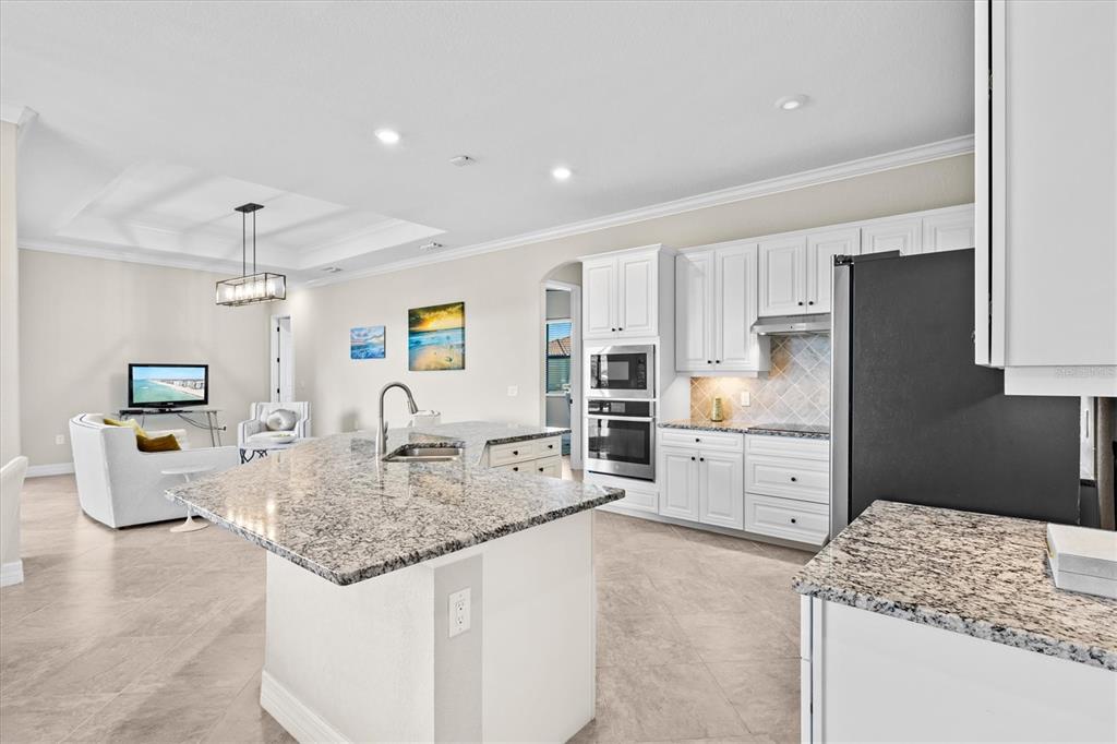 This impeccably maintained, move-in-ready estate home offers the perfect blend of luxury and relaxation within the resort-style community of gran paradiso. built in december 2020 and lightly lived in, this spacious 2,548 sq. ft. lennar "doral" floor plan is the largest one-story lennar model in the community, showcasing distinctive pillared architecture—one of only 20-25 homes of its kind.with four bedrooms and three bathrooms, this home is designed for both comfort and style. upscale finishes such as tray ceilings, crown molding, and low-maintenance tile flooring throughout enhance its elegant appeal. the bright white kitchen and bathroom cabinetry, paired with neutral tones, create a timeless aesthetic. the kitchen features ge profile stainless steel appliances, including a refrigerator with a built-in coffee maker, while the home is fully equipped with digital "smart" technology for modern convenience.