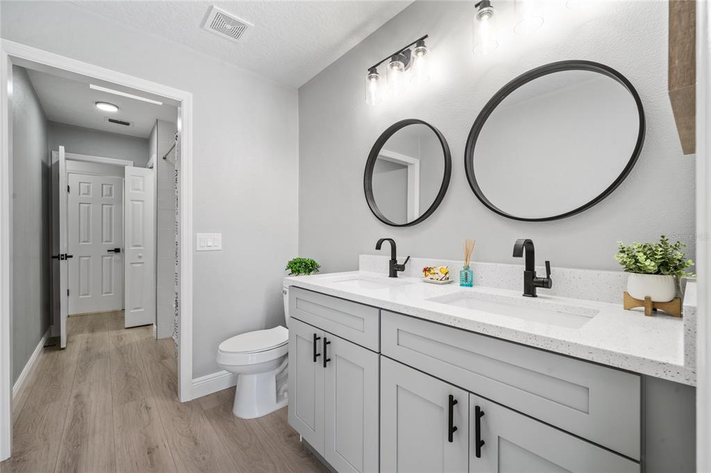 large owner’s suite includes two large walk-in closets!, dual vanities, a pocket door, gorgeous shower with decorative wall on shower-head side. three guest bedrooms on the opposite side of the floorplan provide a private experience for the primary bedroom.