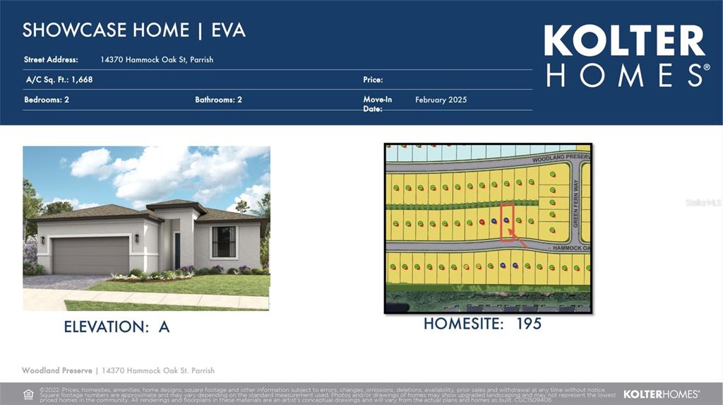 Under construction. **under construction** model photos used for reference. welcome to woodland preserve in parrish this is kolter homes newest 55+ community featuring their brand-new line up of floor plans. the eva floor plan offers open concept living in a spacious 1,668 sq ft single family home with 2 bedrooms, 2 bathrooms a flex room and spacious 2 car front entry garage. the gourmet styled chef kitchen is sure to impress with cafe appliances and a large quartz countertops with plenty of space for your get togethers, the kitchen offers plenty of storage space and full extension drawers and soft close cabinets also a large stainless steel single bowl kitchen sink with decorative kitchen faucet. adjacent to the kitchen is a cozy dining area that flows into your large great room with plenty of windows and 16’ sliding glass doors that allow great natural lighting to flow. enjoy 12x24 porcelain tile flooring throughout this home, the owners suite and secondary bathroom offer floor to ceiling tile on the shower wall and quartz countertops with full extension drawers and soft close cabinets. enjoy the outdoors with plenty of space on your covered lanai. woodland preserve is a quaint community of boutique styled single family homes, the community center which is scheduled for a late 2025 completion will offer a resort style pool with hut tub, ample sitting space around the pool, fitness studio, yoga/pilates studio, card rooms, pool table room, entertaining kitchen, 8 pickleball courts, bocce courts, open green space and community walking trail.14370 HAMMOCK OAK, PARRISH, FL 34219