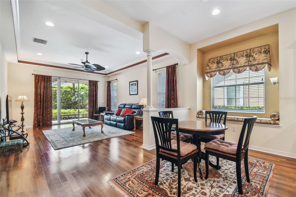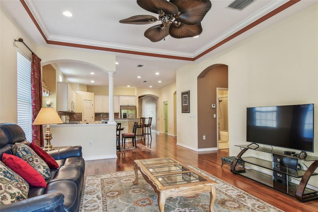 Walk-In Closet(s)Ceiling Fan(s) Open Floorplan Window Treatments Solid Surface CountersCrown Molding Primary Bedroom Main Floor Kitchen/Family Room ComboExterior Features: