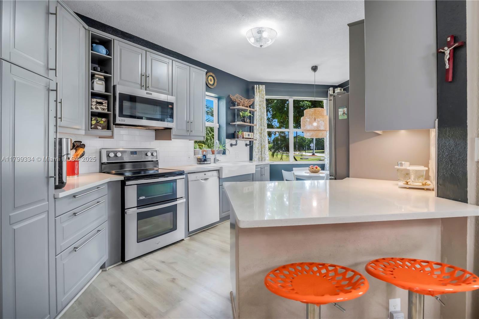 Rarely available first floor corner unit in the prestigious grand palms community in pembroke pines! this move-in ready residence features 3 spacious bedrooms, 2 1/2 modern bathrooms, elegant travertine flooring, a convenient one-car garage, and a screened patio. kitchen is complete with shaker cabinets, quartz countertops, double oven, stainless steel appliances, farmers sink and a breakfast nook. enjoy the comfort and security of this exclusive community—perfect for golf cart cruising, peaceful walks, or bike rides. ideally located with easy access to major highways, top-rated schools, dining, parks, and entertainment. a short drive to both miami (mia) and fort lauderdale (fll) international airports, stunning beaches, world-class shopping, and the vibrant city life of miami and ft laud.14901 SW 15TH ST #14901, PEMBROKE PINES, FL 33027