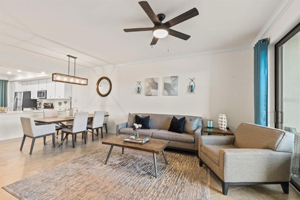 Split Bedroom Walk-In Closet(s)Ceiling Fan(s) High Ceilings Living Room/Dining Room Combo Stone Counters Thermostat Open Floorplan Solid Wood CabinetsCrown Molding Primary Bedroom Main FloorExterior Features:
