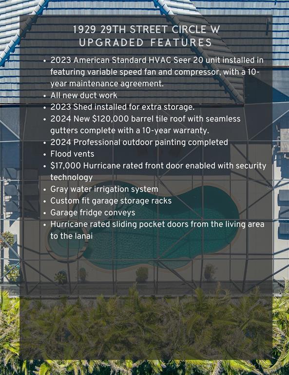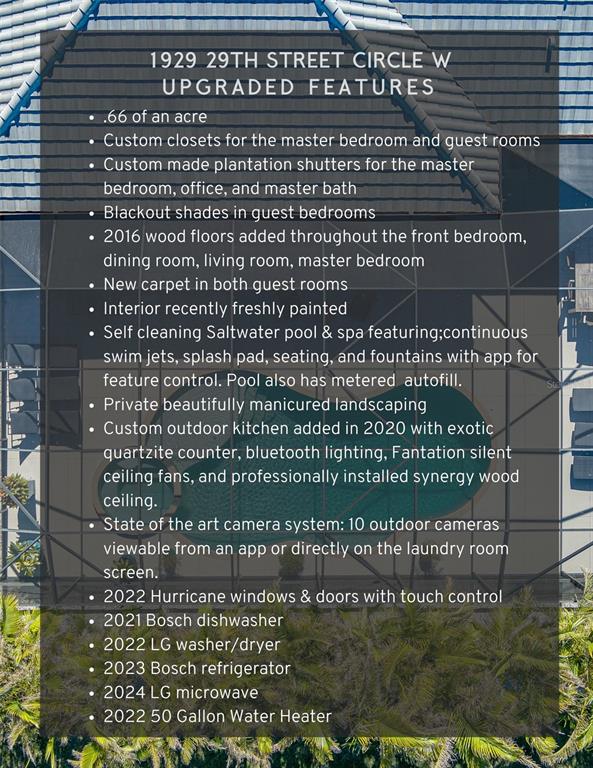 Welcome to your stunning dream home located in the exclusive gated community of boccage in palmetto florida. this luxurious 4-bedroom, 3-bathroom residence is virtually maintenance free and offers an unparalleled lifestyle that has been carefully crafted by the one and only owner of this property. you'll encounter a magnificent saltwater pool, expansive lot, and countless upgrades that cater to your every need. some property highlights include; generous space of over half an acre for outdoor activities and privacy, custom closets for the master bedroom and guest rooms, custom made plantation shutters for the master bedroom, office, and master bath that add elegance and privacy, blackout shades installed in guest bedrooms for restful sleep, updated wood floors installed in 2016 throughout the front bedroom, dining room, living room, master bedroom, new carpet in both guest rooms, interior has been lovingly cared for and recently freshly painted. enjoy an outdoor paradise as you relax by the saltwater pool & spa, featuring continuous swim jets, splash pad, seating, and fountains. each aspect of the pool is controlled via app for the ultimate convenience. the added bamboo and beautifully manicured landscaping offers unmatched privacy around the pool and front yard. the custom outdoor kitchen was added in 2020 with exotic quartzite countertops, bluetooth lighting, fantation silent ceiling fans, and professionally installed synergy wood ceiling. you will never want for safety and security with the state of the art camera system which includes 10 outdoor cameras viewable from an app or directly on the laundry room screen. hurricane windows & doors are the next thoughtful upgrade! installed in 2022, they come complete with touch control for added security. some additional features include: bosch dishwasher (2021), lg washer/dryer (2022), bosch refrigerator (2023), and lg microwave (2024), new american standard hvac unit installed in july 2023, featuring variable speed fan and compressor, with a 10-year maintenance contract. all new duct work was installed as well! shed was newly added in 2023 for extra storage. new barrel tile roof with seamless gutters installed in august 2024, complete with a 10-year warranty. professional outdoor painting completed in august-september 2024, ensuring a fresh and appealing look. this home also comes equipped with flood vents making insurance readily attainable and extremely affordable. boccage is known for its exclusivity and tranquil environment, providing residents with a sense of security and community. enjoy nearby parks, shopping, and fine dining. don’t miss the opportunity to own this magnificent home that combines luxury, comfort, and modern conveniences. schedule your private tour today and experience the lifestyle that awaits you in boccage! this home is more than just a property; it's a sanctuary designed for those who appreciate the finer things in life.1929 24TH ST W, PALMETTO, FL 34221