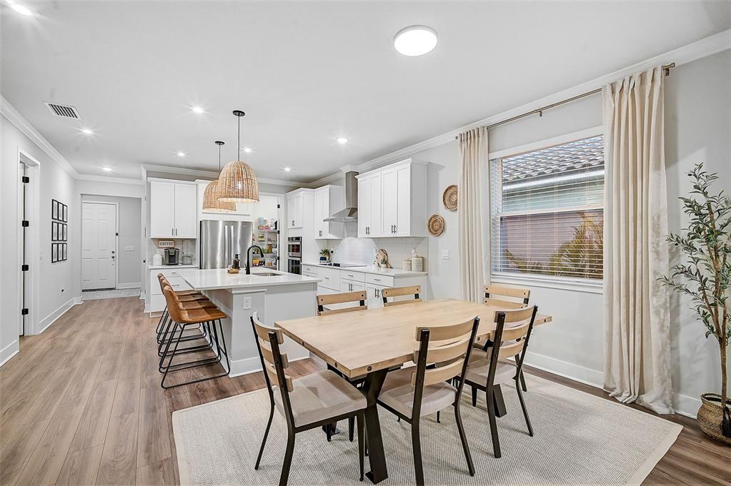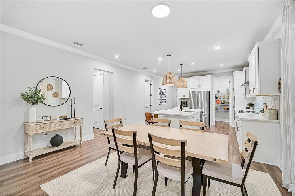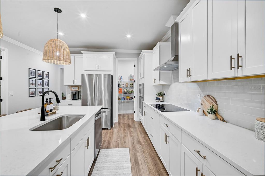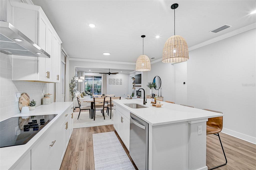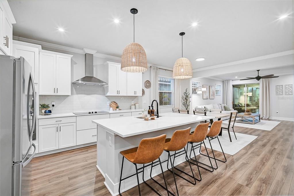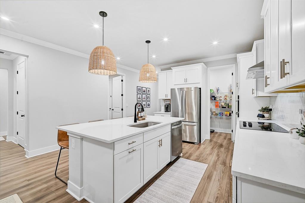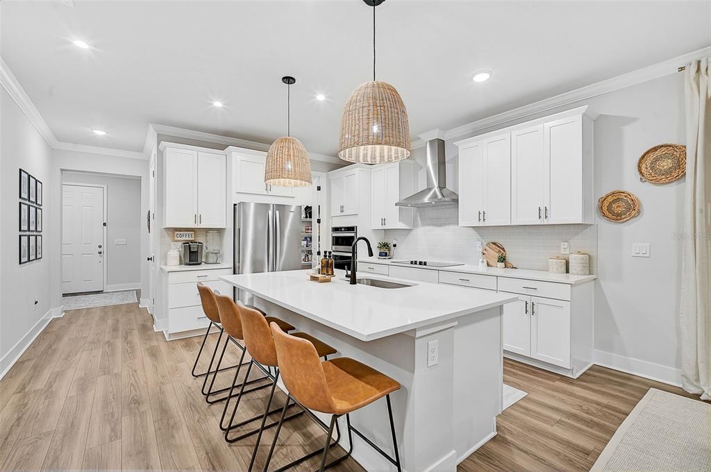 the open-concept kitchen is a chef’s dream, offering a large quartz island, whirlpool stainless steel appliances, custom tile backsplash, upgraded pendant lighting, and a generous walk-in pantry. this layout is perfect for entertaining or enjoying family meals in style.