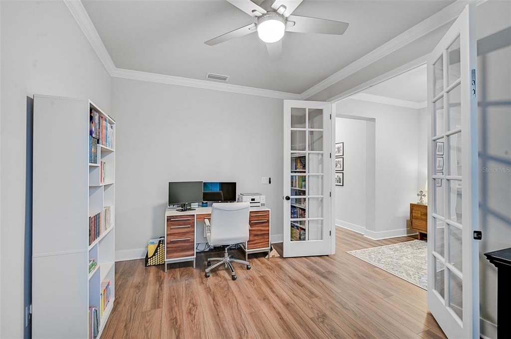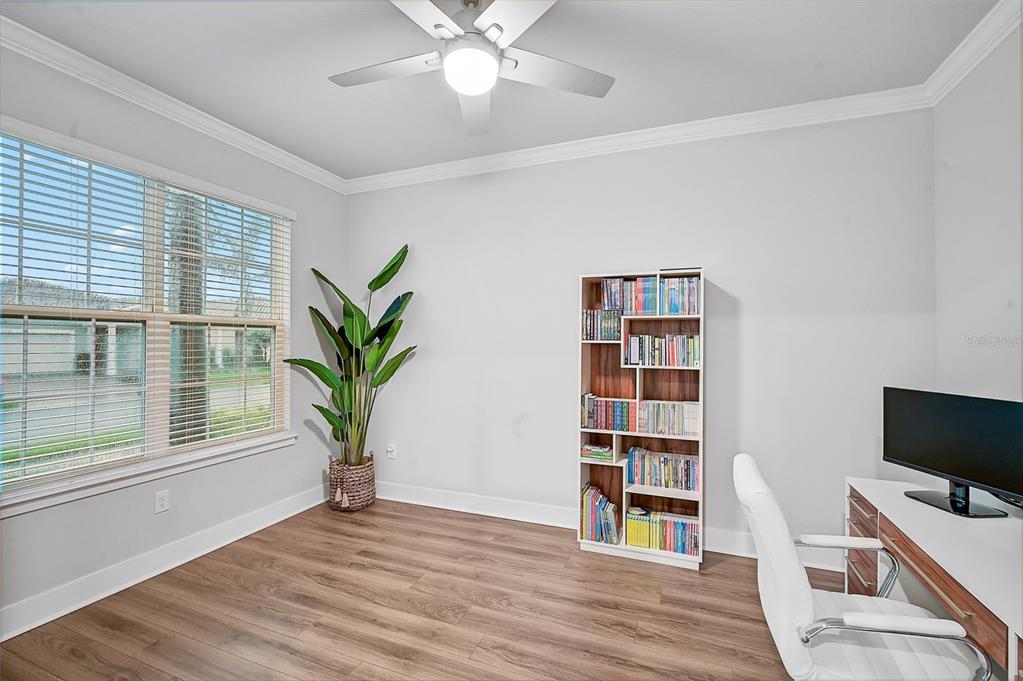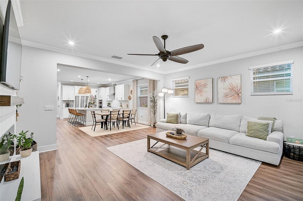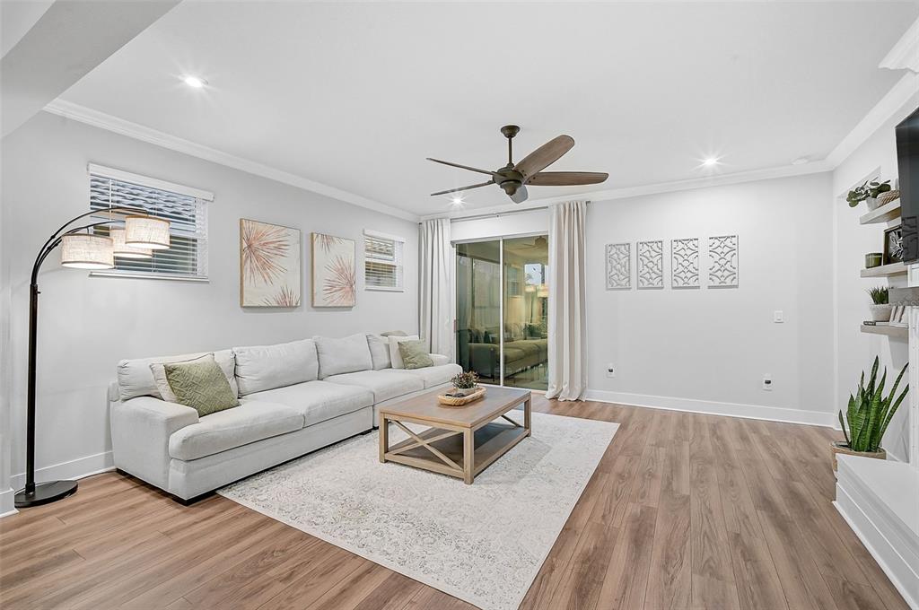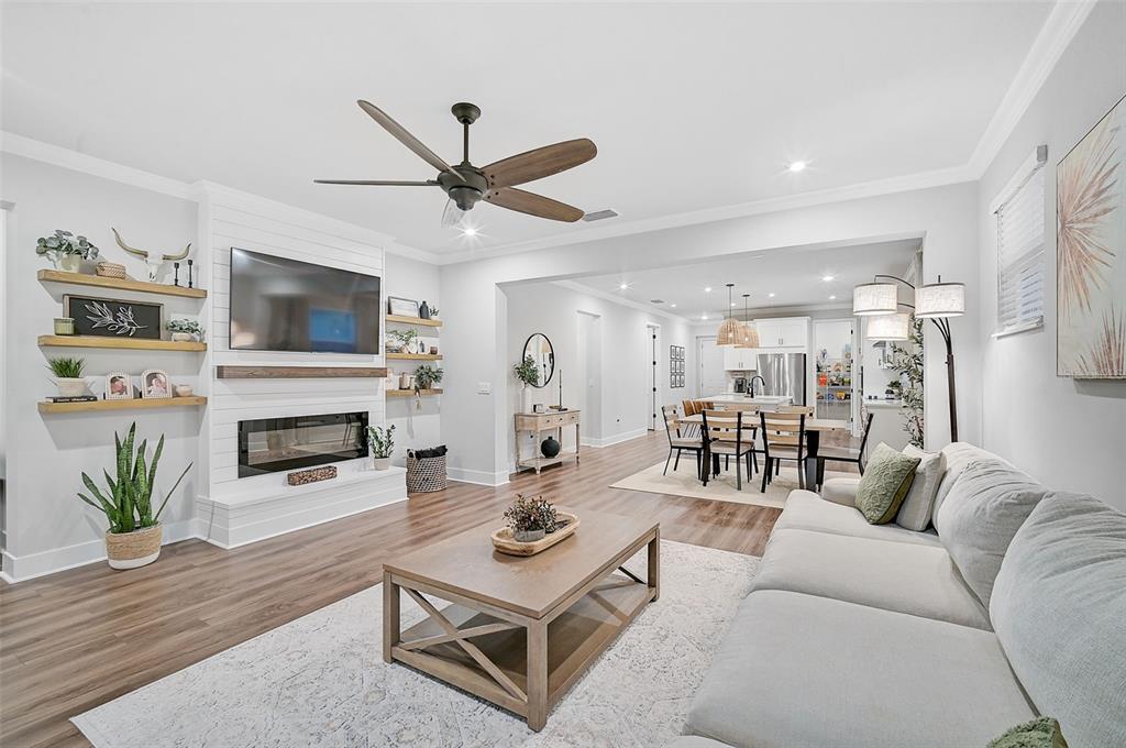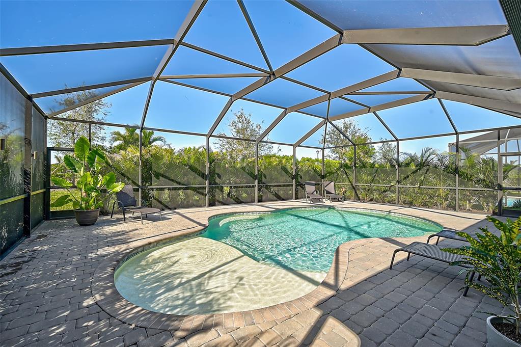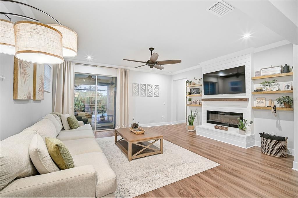 Welcome to the renaissance at wellen park, a resort-style, maintenance-free community where every day feels like a vacation. this stunning dominica model boasts nearly 2,400 sq. ft. of living space, featuring 4 spacious bedrooms, 2.5 baths, and a versatile den/office. lovingly maintained by its original owners, this home offers exceptional curb appeal and a backyard oasis you’ll fall in love with—a solar-heated saltwater pool nestled inside a private, screened lanai.step inside to find luxury vinyl plank flooring throughout most of the home, crown molding, recessed lighting, and countless custom upgrades. the cozy entryway welcomes you with added designer touches, while 8’ doorways, 42” white shaker cabinets, quartz countertops, and upgraded lighting elevate the interior. the living room features a custom-built mantle with an electric fireplace, shiplap accents, and floating shelves, creating the perfect blend of style and comfort.