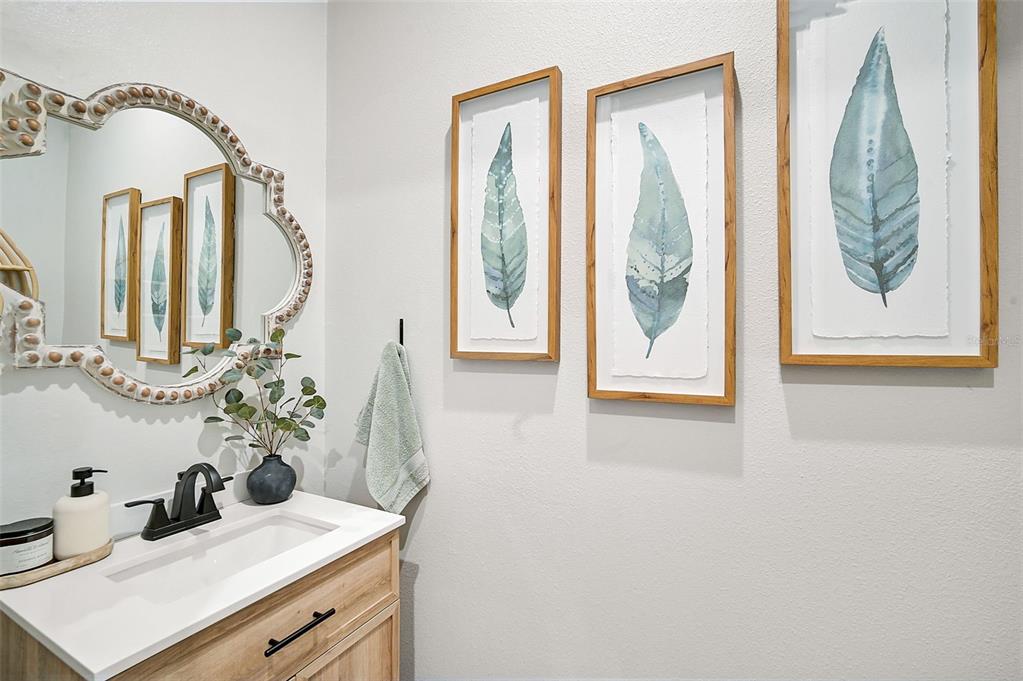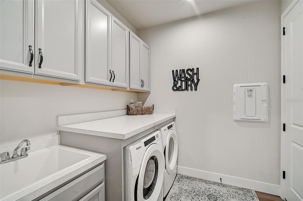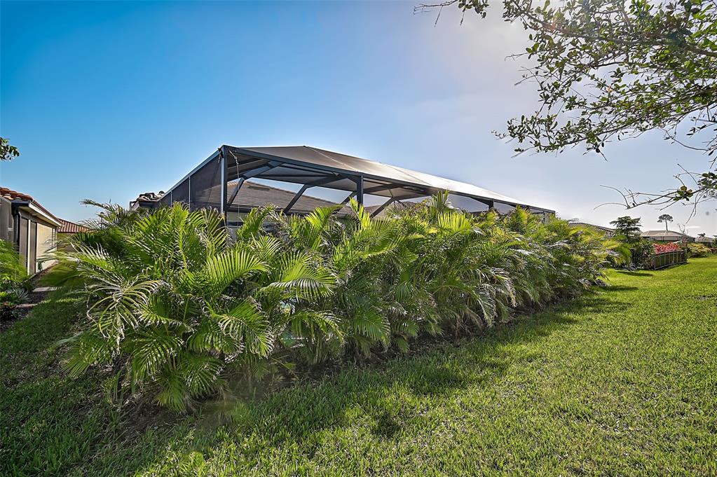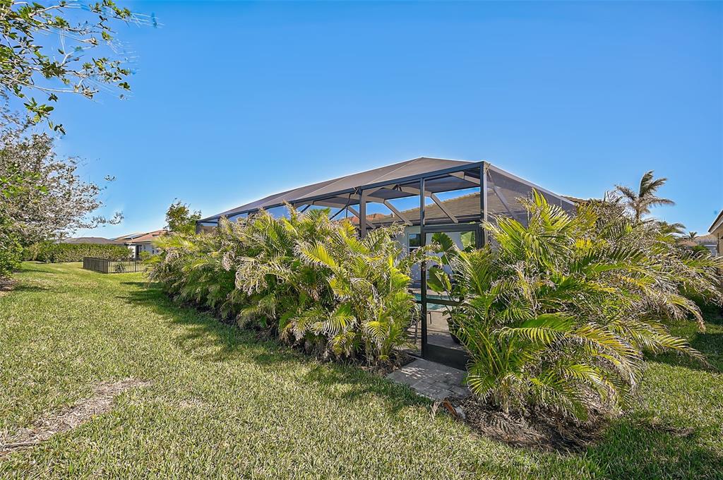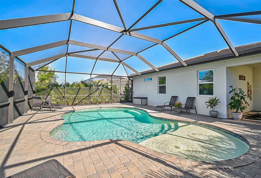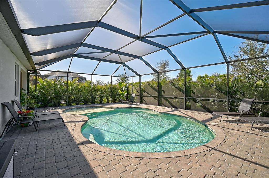 the highlight of this home is the spectacular backyard. relax on the expansive screened lanai, take a refreshing dip in the solar-heated pool, or lounge under the sun. the saltwater pool is enhanced with state-of-the-art led lighting and additional lighting on the lanai pillars, while lush landscaping ensures added privacy. the garage floor has been epoxied and has overhead storage racks attached to the ceiling.