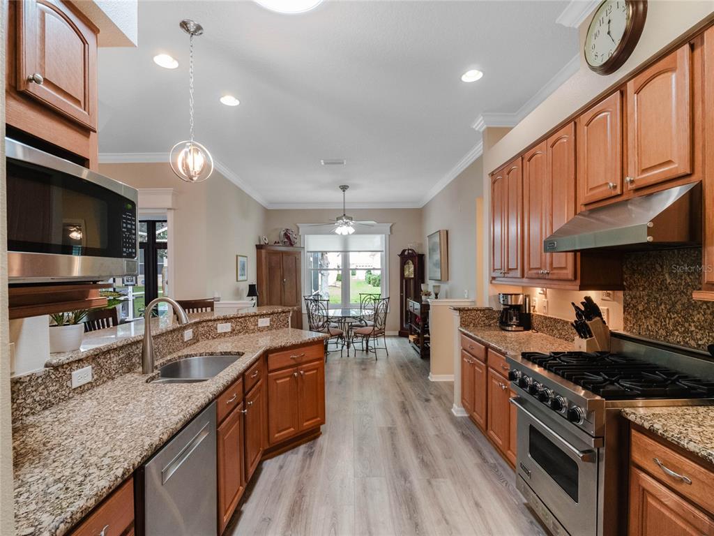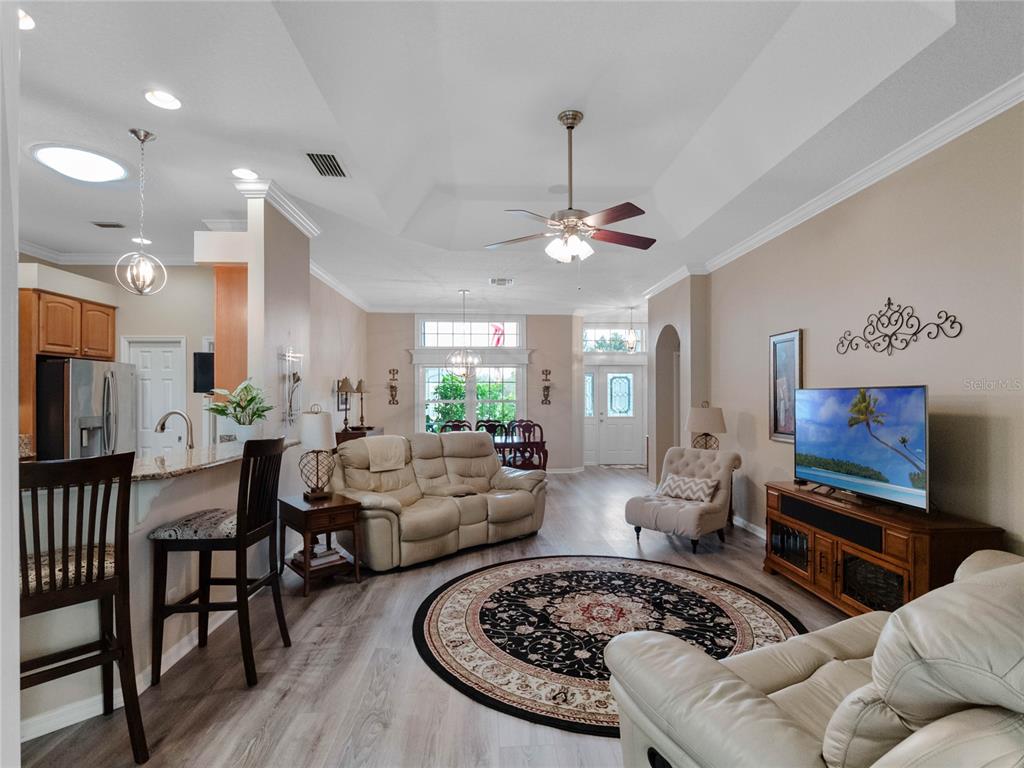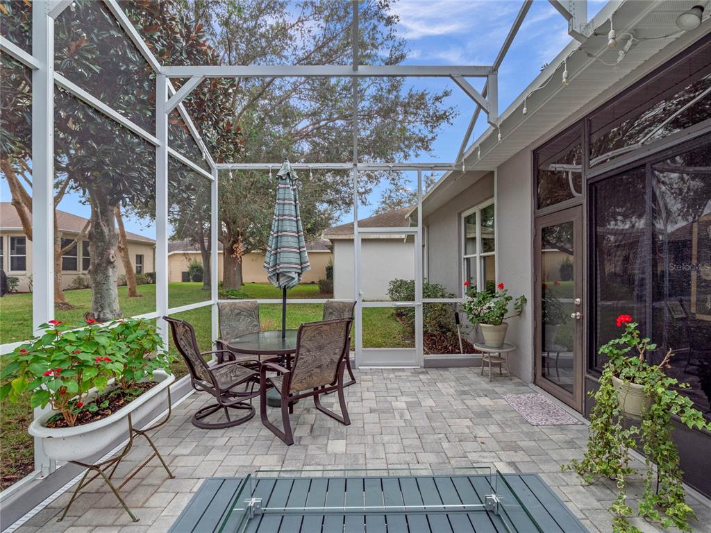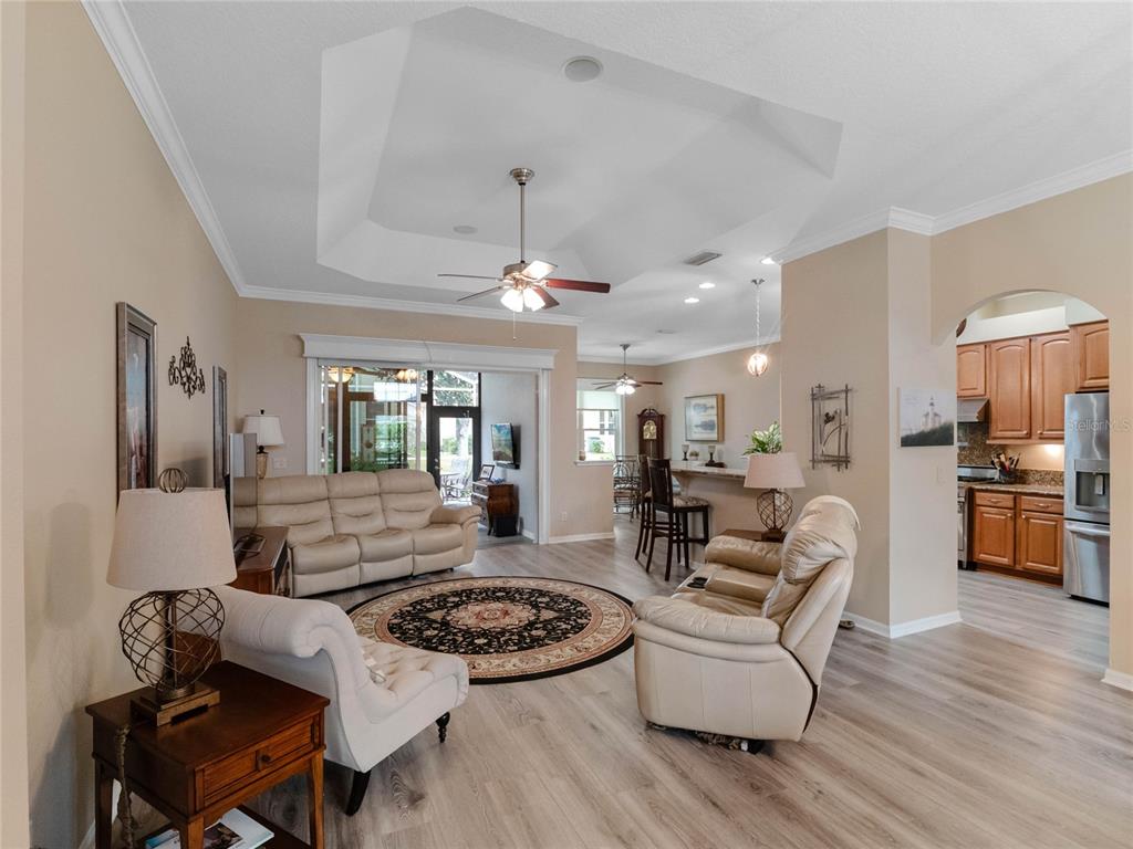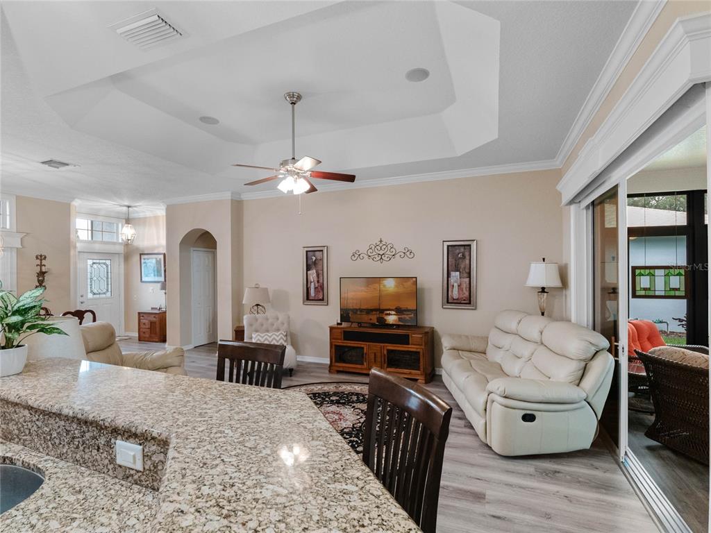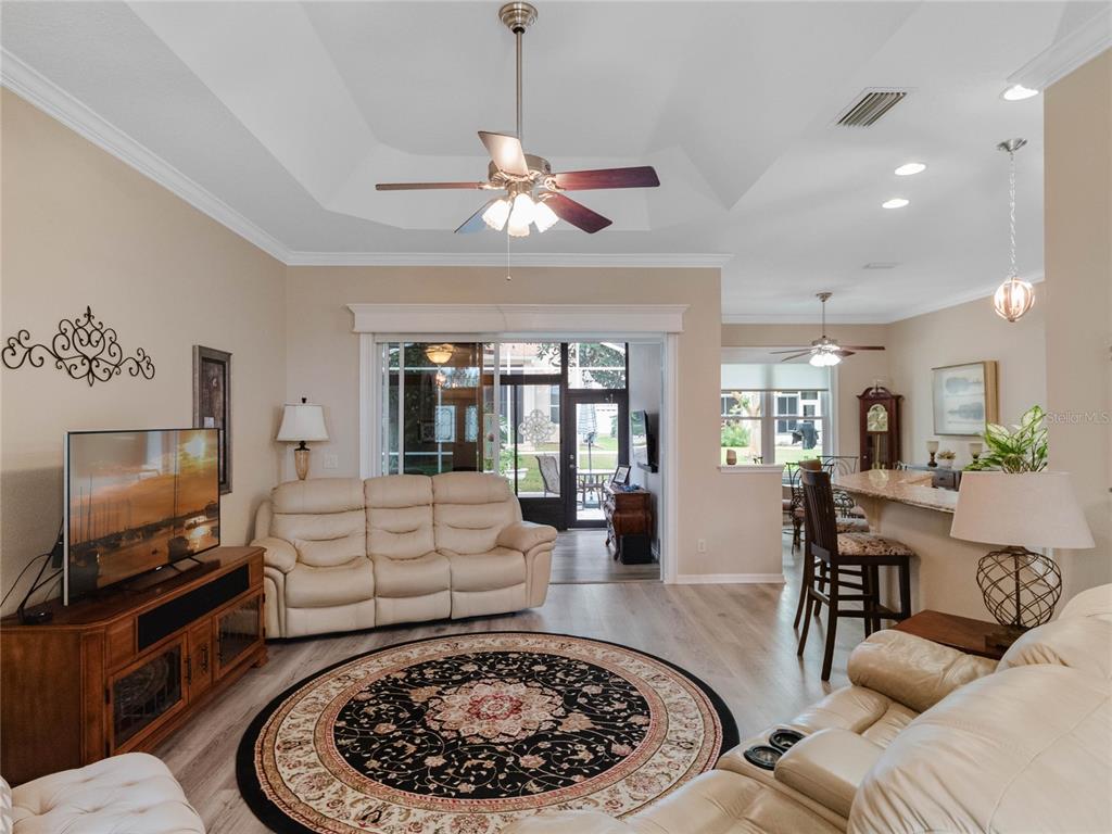 One or more photo(s) has been virtually staged. step inside this gorgeous regent model with both, florida room and screened lanai! as you drive up to this block and stucco home, you’ll see the attention to details on the exterior. freshly painted, well maintained, lush landscaping, screened entry porch, and the epitome of luxury florida living! the interior has been considered from floor to ceiling. luxury vinyl plank flooring throughout, as well as crown molding and tray ceilings! the dining area offers updated lighting and you’ll love the plantation shutters in all three bedrooms! the kitchen has an amazing viking gas range, stainless steel appliance package, pantry, pull-outs, 42” upper cabinets, accent lighting, granite countertops, and wood cabinets. the guest area gives visitors a cottage charm and welcoming vibe thanks to the beadboard cabinet fronts and high-end cambria quartz counters. the primary suite puts this home over the top with its cambria quartz counters, walk-in roman shower with coastal glass tile accents, double vanity, walk-in closet, and high ceilings. this split bedroom floor plan has solar skylights that allow tons of natural light throughout the main living area, casual and formal dining areas, and inside laundry with appliances that convey, and a huge florida room! create the oasis you’ve always dreamed of! there is nothing else to do to this home except move in! updated fans, lighting, paint, floors, transferable termite bond, fully irrigated and featuring a 2023 roof! hvac was updated in 2015, rear cage was screened in 2020, garage door was updated in 2023, and all windows were replaced in 2022. come enjoy 1939 square feet of living area, which includes the florida room and all under-air living spaces. royal highlands is an 18-hole championship golf community with a restaurant, pro shop, driving range and putting greens. the recreation center offers residents two pools, courts, library, craft and meeting rooms, kiln, and a fitness center. dance the night away at the great hall with theater stage and full stainless kitchen. this gated community has a low monthly hoa fee that includes cable and internet! close to mco, amusement parks, shopping, medical facilities and restaurants. call for your tour today!20744 QUEEN ALEXANDRA, LEESBURG, FL 34748