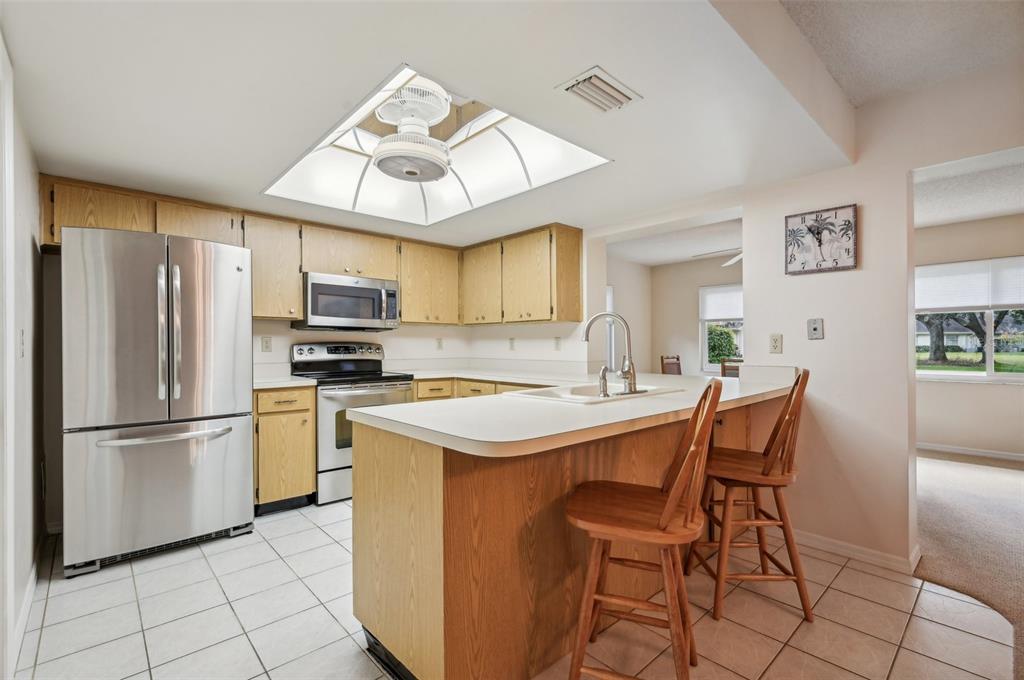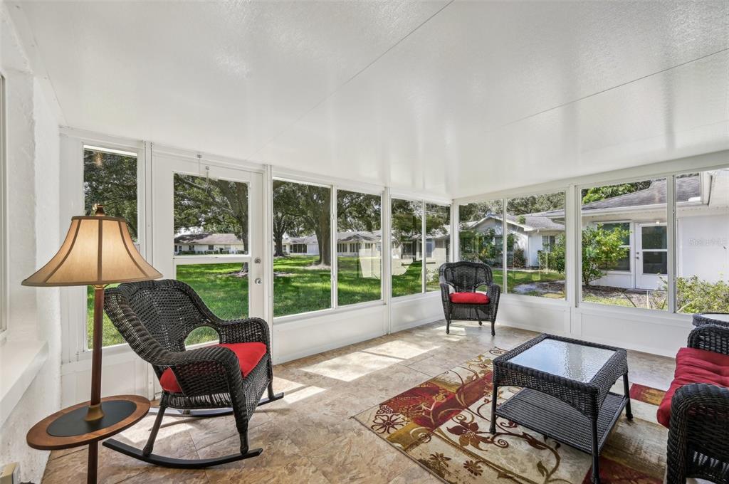 Welcome to this fully furnished, move-in ready 2-bedroom, 2-bathroom home with a desirable brentwood i floorplan in the kings point community! with 1,448 square feet of living space, this home offers a comfortable and functional layout, perfect for relaxed florida living. this home has a kpw gold plan, which can be transferred upon request. the open-concept living and dining area provides a bright and welcoming atmosphere, featuring a large window in the living room that opens up to the spacious florida room. this room, with its tall windows and tiled floors, offers a serene view of the lush green space adorned with oak trees, making it a perfect place to unwind. just off the kitchen, you’ll find a versatile space with a passthrough and bar seating, which can be used as a cozy den or a formal dining room. large windows in this area flood the room with natural light, making it a delightful spot for meals or relaxation. the kitchen itself is equipped with matching stainless steel appliances, bar seating, and a ceiling fan for added comfort. the primary bedroom is generously sized and features laminate flooring and a walk-in closet for ample storage. the attached bathroom has been updated with white paneled cabinets, a solid surface countertop, and a sleek glass shower. the secondary bedroom also has laminate flooring and access to an updated bathroom with wood cabinetry and a solid surface countertop. recent updates include a new water heater in march 2024, and the driveway was coated this year as well. additional highlights include a spacious laundry room and a convenient golf cart garage, offering extra storage space. this home’s combination of comfortable living areas and functional design makes it an ideal choice for those seeking a peaceful retreat in kings point. the gated community of kings point has amazing facilities, pools, and clubs just waiting for you to enjoy. located between sarasota and tampa, the perfect location for a convenient ride to airports, great shopping, dining, professional sports, and entertainment. with easy access to award-winning, sandy beaches, this is the best of all worlds, but without the stress of big city life. leave it all behind and enjoy your new life here in one of florida’s most affordable 55 and better communities!2102 HAILSTONE, SUN CITY CENTER, FL 33573