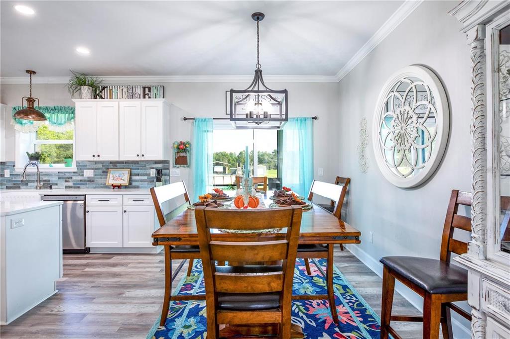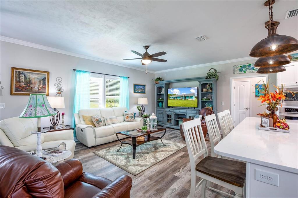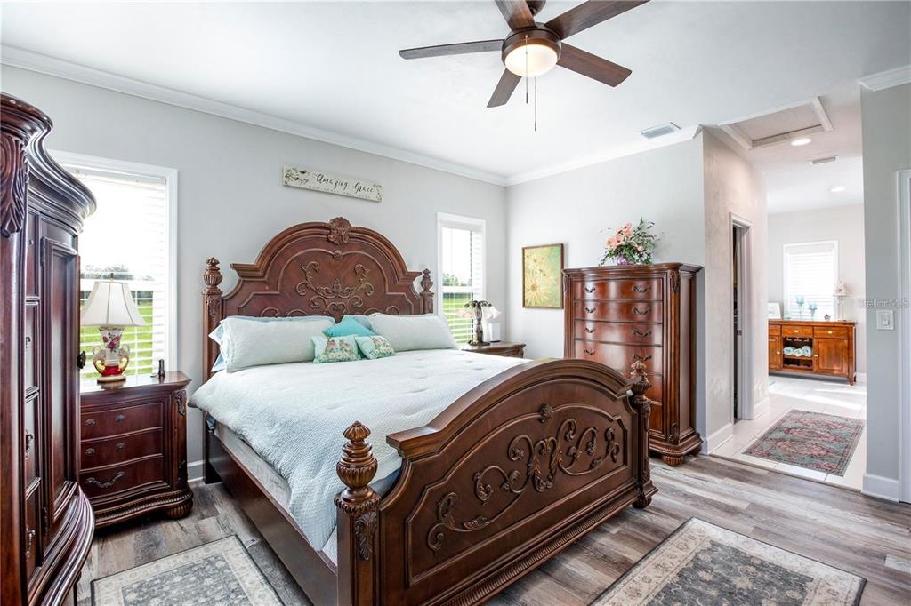 Split Bedroom Walk-In Closet(s)Ceiling Fan(s) Eating Space In Kitchen Stone Counters Open Floorplan Window Treatments Solid Surface Counters Solid Wood CabinetsCrown Molding Primary Bedroom Main FloorExterior Features: