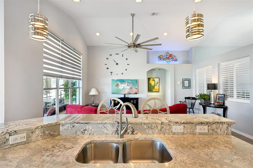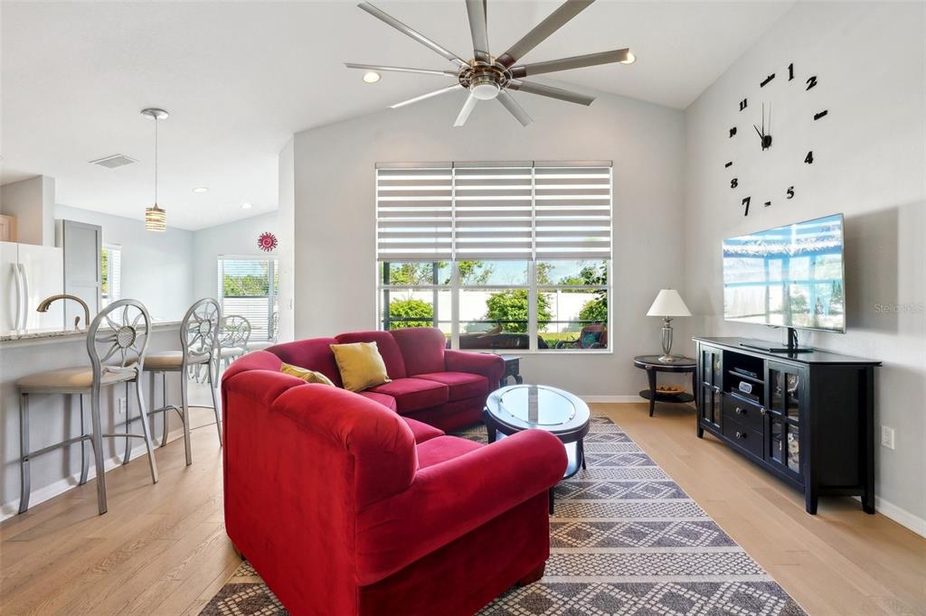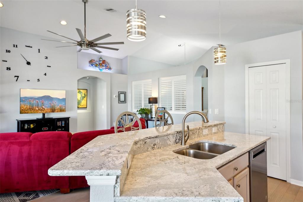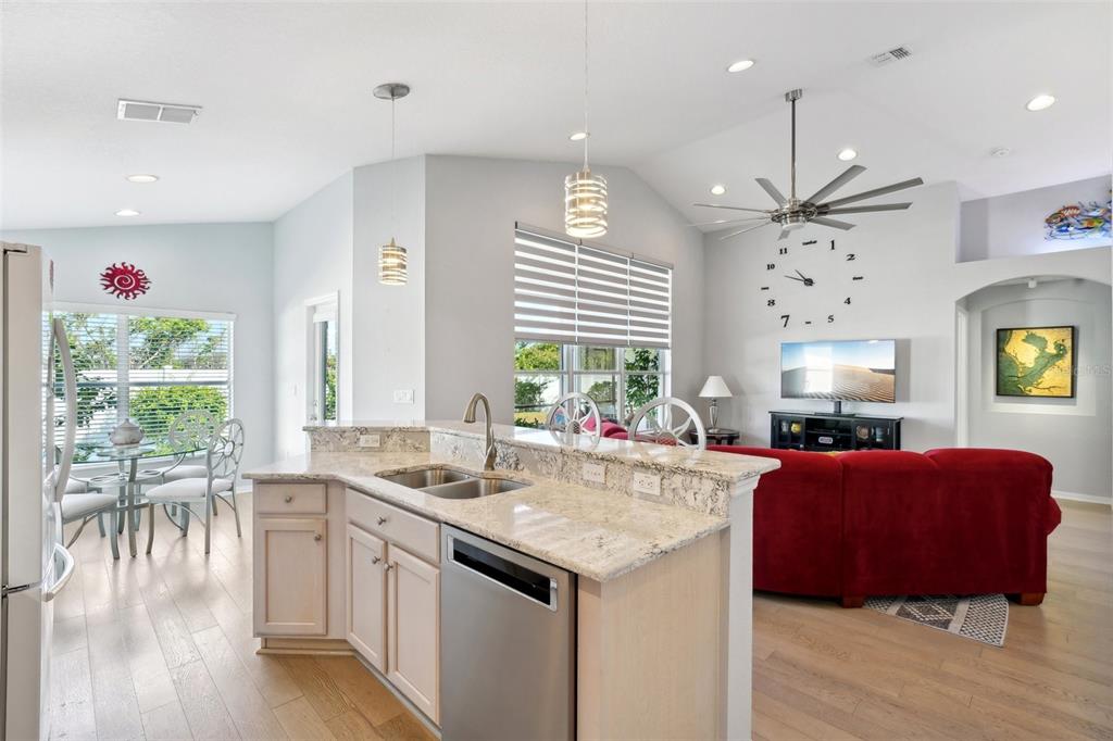 Split Bedroom Walk-In Closet(s)Ceiling Fan(s) Eating Space In Kitchen High Ceilings Living Room/Dining Room Combo Stone Counters Thermostat Open Floorplan Window Treatments Primary Bedroom Main Floor Kitchen/Family Room Combo L Dining Smart HomeExterior Features: