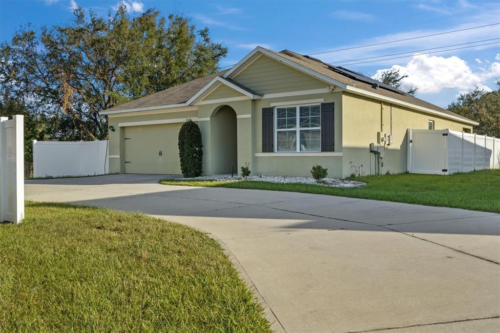 Welcome to 2304 rose blvd, winter haven, florida! this charming 3-bedroom, 2-bathroom home, built in 2019, is a wonderful blend of modern design and comfort. perfectly situated just a few minutes from polk state college, winter haven hospital, and all the attractions, dining, and shopping winter haven has to offer, this home provides the convenience of city living in a peaceful community setting. sitting on an oversized corner lot, there is plenty of room to spread out and enjoy outdoor activities. the backyard is fully fenced with a durable white vinyl fence, offering not only privacy but also a safe space for pets or children to play. the extra-large concrete driveway provides ample parking for multiple vehicles, making it perfect for families or those who love to host guests. inside, you’ll find a welcoming open floor plan that combines the kitchen, dining, and family rooms—ideal for entertaining and daily family life. the high ceilings add an airy and spacious feel, while the split floor plan ensures privacy between the main bedroom and secondary bedrooms. the inside laundry room offers added convenience, with easy access to the main living spaces. the spacious kitchen is a chef's delight, featuring a large island, sleek quartz countertops, plentiful cabinet storage, and a roomy pantry to keep everything organized. it’s fully equipped with modern appliances, making it easy to prepare meals while still being part of the conversation in the family room. the two comfortable secondary bedrooms are well-sized, each with built-in closets that offer plenty of storage space. the main bedroom is truly a retreat, offering tranquility and ample space to unwind after a long day. it boasts a large walk-in closet, providing abundant storage space, and an en-suite bathroom featuring a spacious shower (no tub), a private water closet, dual vanity sinks, and elegant tile flooring. step outside and you’ll find a lovely 6’x10’ covered porch—perfect for sipping your morning coffee or enjoying an evening breeze. the expansive backyard is a blank canvas, ready for a play area, garden, or even a pool if you desire. this community does not have a cdd, which means your property taxes will be more affordable. additionally, the low-cost hoa is only $300 per year. for added savings, the home comes with an assumable solar panel system, offering substantial reductions on your monthly electricity bill—a great bonus for those looking to live more sustainably. this home offers the perfect combination of space, comfort, and energy efficiency in a fantastic location. don’t miss your chance to make this wonderful property your own—schedule your showing today before it’s gone!2304 ROSE, WINTER HAVEN, FL 33881