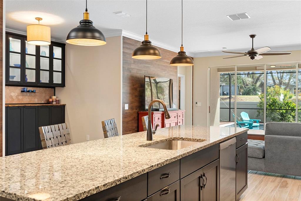 Split BedroomBuilt-in Features Walk-In Closet(s)Ceiling Fan(s) Eating Space In Kitchen High Ceilings Stone Counters Thermostat Open Floorplan Window Treatments Solid Surface Counters Primary Bedroom Main Floor Kitchen/Family Room Combo Smart Home Pest Guard System Dry BarExterior Features: