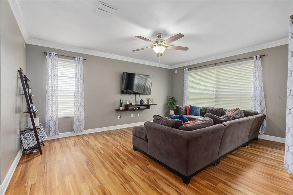 Walk-In Closet(s)Ceiling Fan(s) Living Room/Dining Room Combo Stone Counters Thermostat Open Floorplan Solid Wood CabinetsCrown Molding Kitchen/Family Room Combo PrimaryBedroom Upstairs Tray Ceiling(s)Exterior Features: