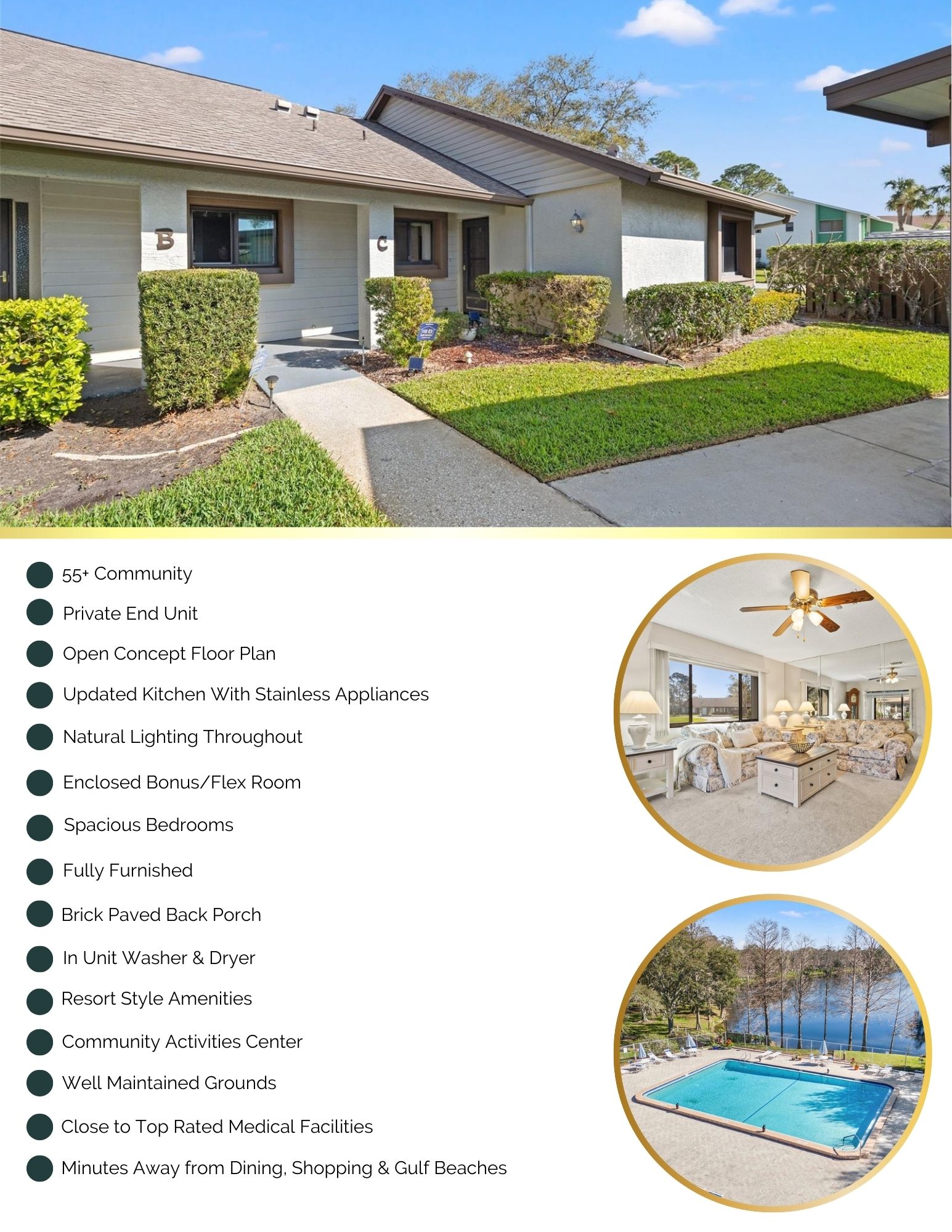Welcome to village on the green, a highly desirable 55+ community offering a tranquil, maintenance-free lifestyle in a prime location. this fully furnished beautifully maintained 2-bedroom, 2-bath condo is an end unit, providing extra privacy and an abundance of natural light. with 935 square feet of thoughtfully designed living space, this home is perfect for those seeking both comfort and convenience. step inside to discover an open-concept floor plan that seamlessly connects the spacious living room, dining area, and kitchen. the living space extends into a versatile enclosed bonus/study room, where you can enjoy breathtaking tranquil pond views—a perfect spot for reading, working, or simply unwinding in peace. the primary bedroom offers a private ensuite bath, ample closet space, and large windows that bring in soft natural light. the second bedroom is equally inviting, ideal for guests or additional living space. the condo also features an open patio, providing an outdoor retreat where you can relax and enjoy the florida sunshine. residents of village on the green enjoy an array of resort-style amenities, including a beautiful clubhouse with a library, fitness area, kitchen, and a spacious gathering room for social events. outdoor enthusiasts will appreciate the shuffleboard courts and the pristine, resort-style community pool, where you can lounge and soak up the serene surroundings. additional conveniences include assigned covered parking, extra storage, and low monthly fees, making this a fantastic opportunity for those looking to embrace a low-maintenance lifestyle. with its prime location, village on the green is just minutes from shopping, dining, top-rated medical facilities, and the stunning gulf beaches, allowing you to experience the best of florida living. don't miss your chance to own this charming end-unit condo in one of the area's most sought-after 55+ communities. move in ready and just waiting for you.2576 LAURELWOOD #13C, CLEARWATER, FL 33763