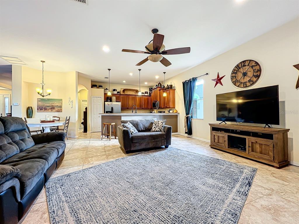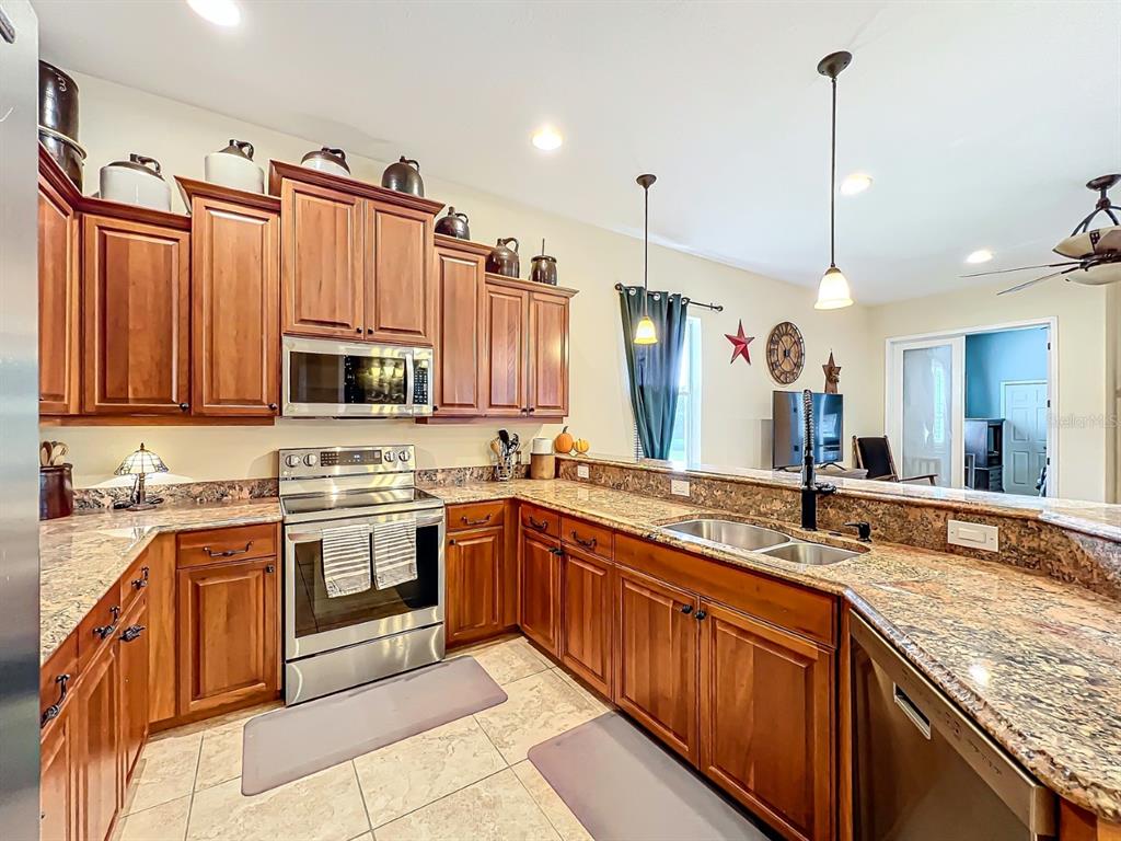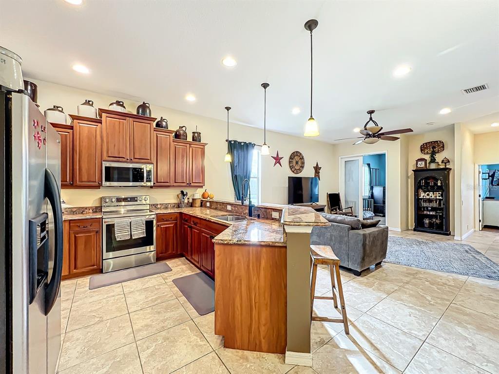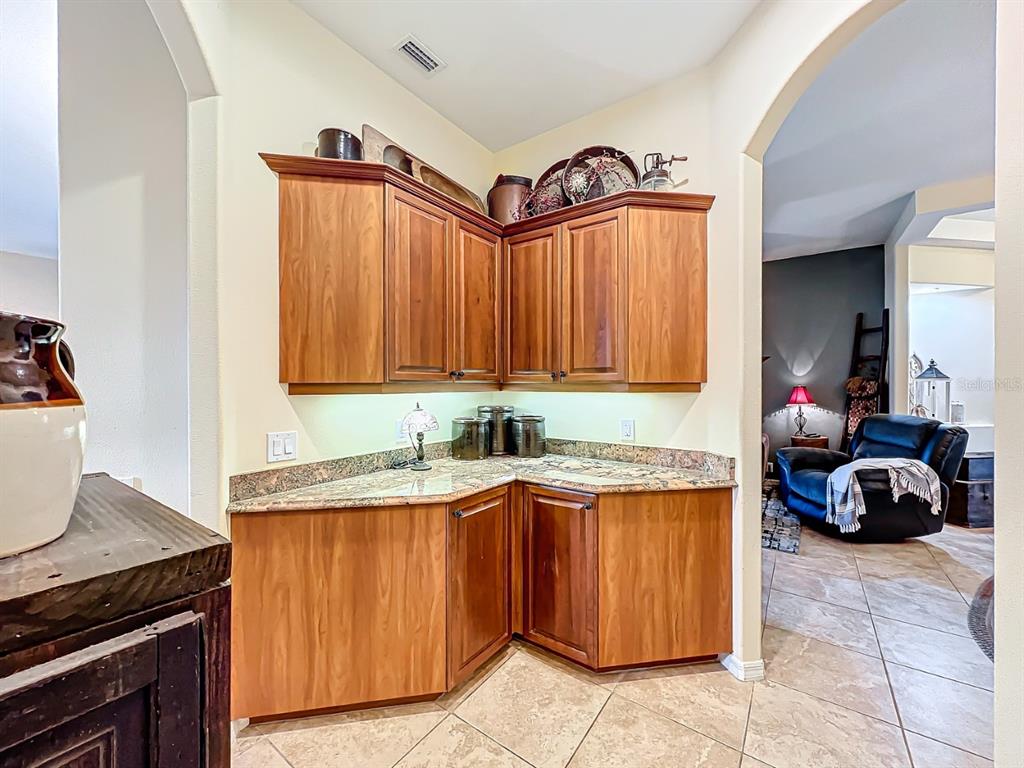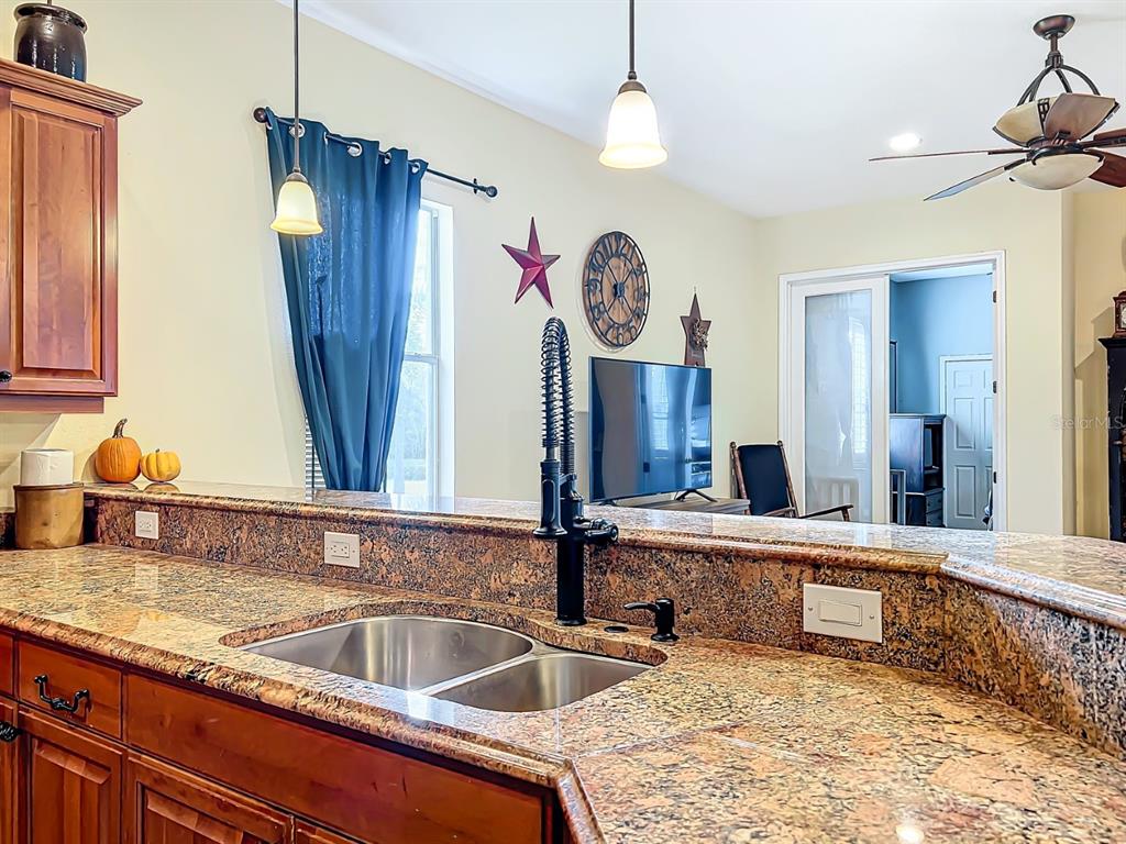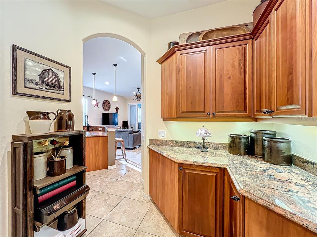Split BedroomCeiling Fan(s) High Ceilings Stone Counters Open Floorplan Solid Wood Cabinets Kitchen/Family Room ComboExterior Features: