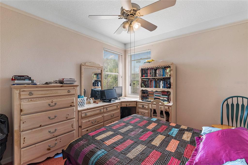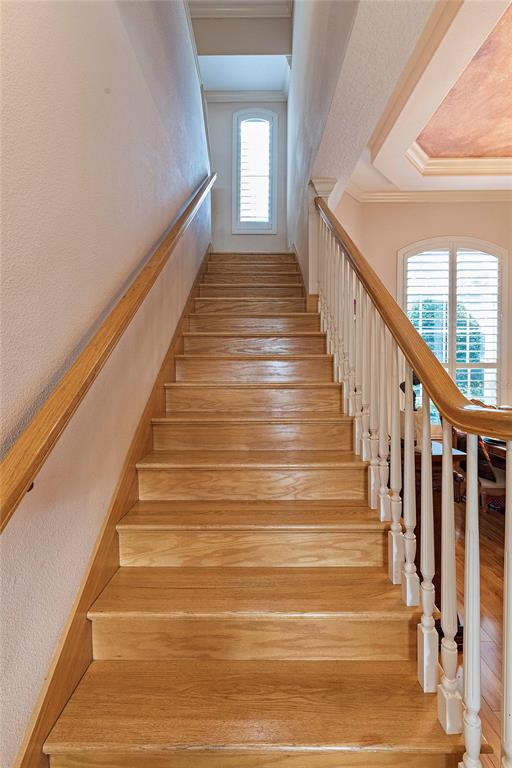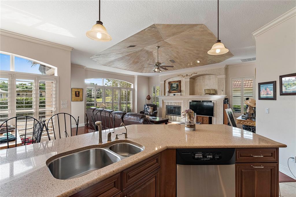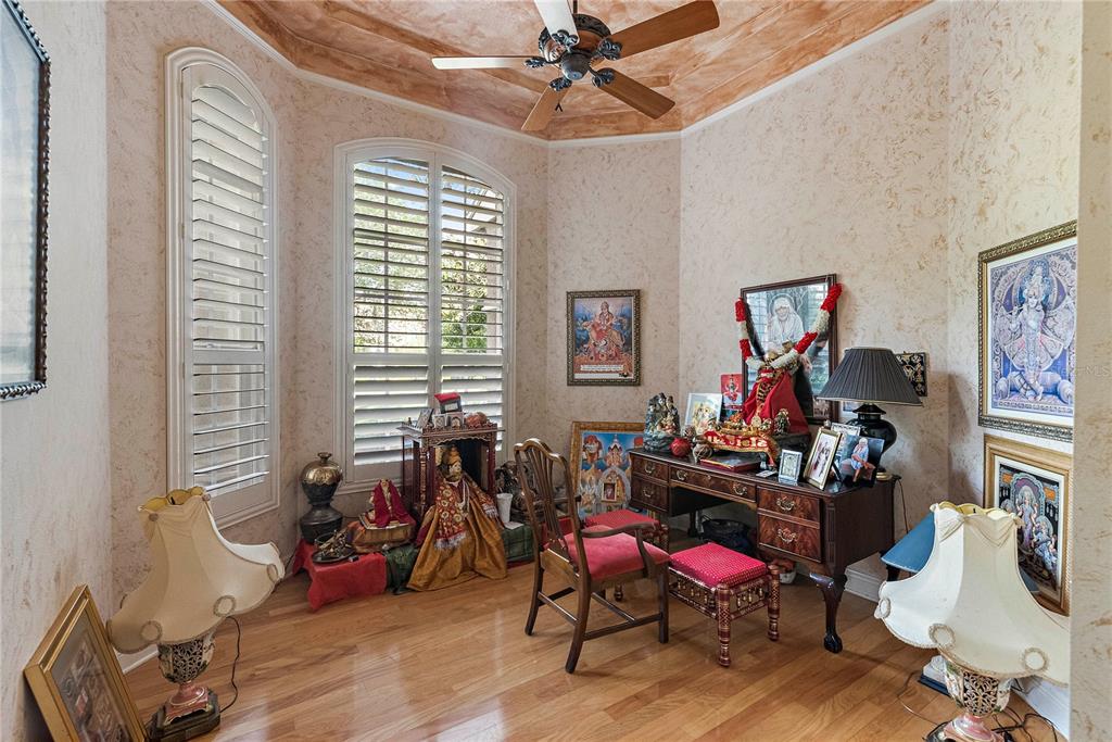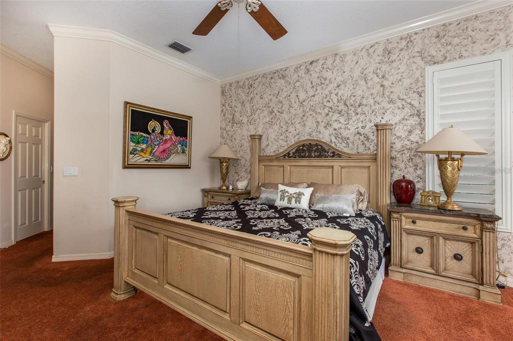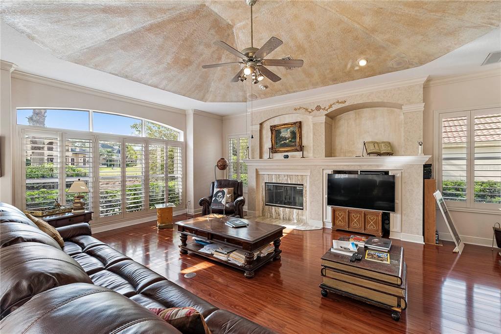 Split Bedroom Walk-In Closet(s)Ceiling Fan(s) High Ceilings Stone Counters Thermostat Open Floorplan Window Treatments Solid Wood CabinetsCrown Molding Primary Bedroom Main Floor L DiningCathedral Ceiling(s)Exterior Features:
