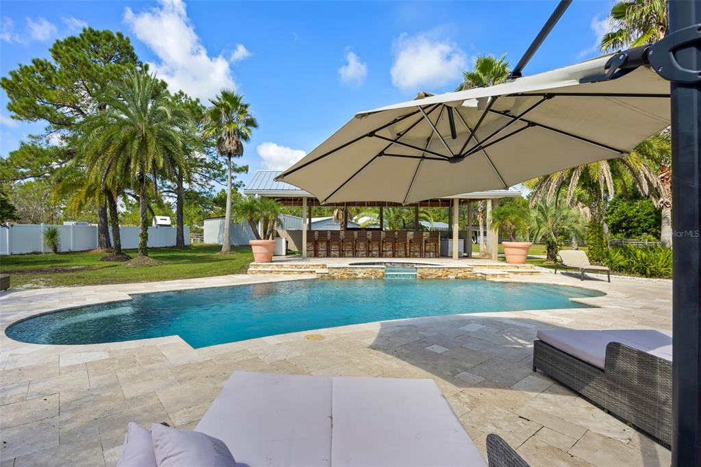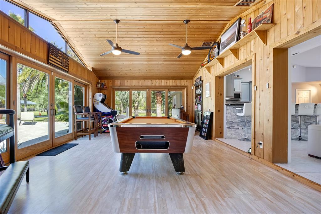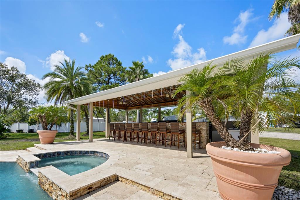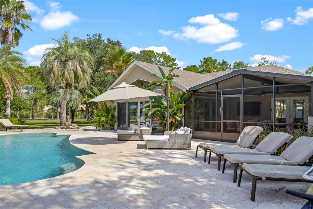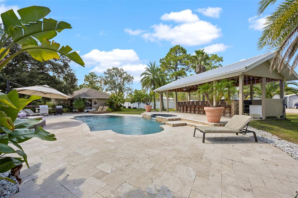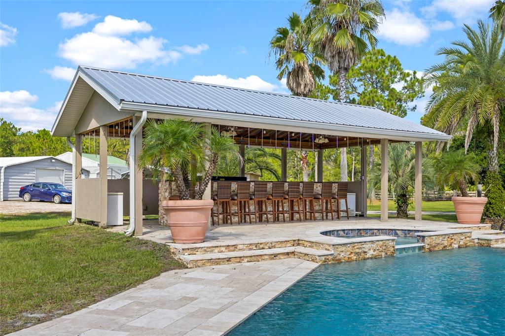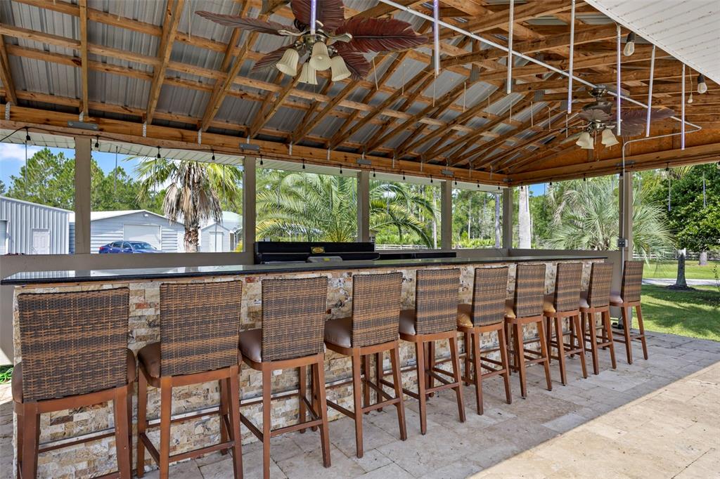 Take a look at this retired equestrian property that has been transformed into a family compound or investment opportunity. there are three homes situated on over 5 acres of land, providing plenty of space for all your equipment and toys. the main home is a 3-bedroom, 2-bathroom property with a newly remodeled kitchen, updated bathrooms, and french doors in every room. additionally, there is a detached mother-in-law suite that features 1 bedroom and 1.5 bathrooms, along with its own 2-car carport. the third home is a two-story apartment-style property with 3 bedrooms and 1 bathroom, and it comes with a 4-car carport. each home has its own living room, kitchen, and washer and dryer appliances. you can take a leisurely stroll around the lake, which is adorned with mature palm trees and updated landscape lighting. the main home also includes a 6-car garage with a drive-thru bay. in the heart of the 5-acre property, there is a captivating saltwater pool and spa outdoor oasis with beautiful travertine flooring. the pool area is equipped with a 10-seat fully operational bar, commercial 3-bay sink, speed bar, full liquor display, and ice chest. the electrical and plumbing are already set up. additionally, the property is conveniently located just two miles from the st. john river.32840 PONDEROSA, DELAND, FL 32720