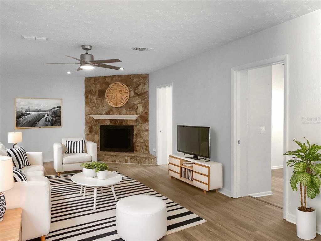One or more photo(s) has been virtually staged. welcome home to this charming property featuring a cozy fireplace, a soothing natural color palette, and a beautiful backsplash in the kitchen. the home offers additional rooms for flexible living space and a primary bathroom with ample under sink storage. step outside to the fenced backyard with a covered sitting area, perfect for entertaining or relaxing. the interior boasts fresh paint and new flooring throughout, adding to the overall appeal of this lovely home. don't miss out on the opportunity to make this your own oasis.3305 ACAPULCO, RIVERVIEW, FL 33578