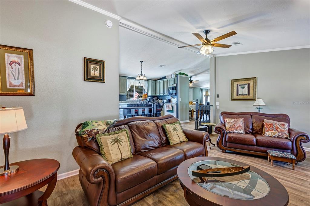 This manufactured home has been updated and is ready to move right in! walk into the kitchen with granite countertops, an island with space for seating, laundry closet th. the kitches is open to the great room. the large great room has an electric fireplace, specialty lighting. the dining room and living room provide more wide-open living space. there are 3 split plan bedrooms, 2 bathrooms (both updated). there is a large florda room which is decorated to be used as a game room or family space. it's bright and would make an excellent craft room! the roof was replaced just after purchase, the house has been upgraded and is tastefully decorated. the furnishings can convey.. this property is ready for you to move in. the best thing about this home is the convenient location and there is no hoa! flooring, ceiling fans, lighting, switches, outlets were all replaced, the garage has a separate storage room, there is a shed in the back yard. the water softener conveys. there is a new tankless hot water tank. there is a storage room in the garage with shelving! there are plenty of extras in this home whether it will be your primary or secondary home. the back yard is fenced and there is an additional storage shed. call your real estate professional or the listing agent to arrange a private showing today!34808 BARGER, LEESBURG, FL 34788