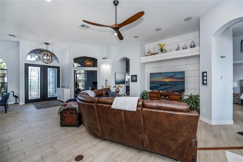 Split Bedroom Walk-In Closet(s)Ceiling Fan(s) High Ceilings Thermostat Open Floorplan Window Treatments Solid Surface Counters Solid Wood Cabinets Primary Bedroom Main Floor Kitchen/Family Room ComboExterior Features: