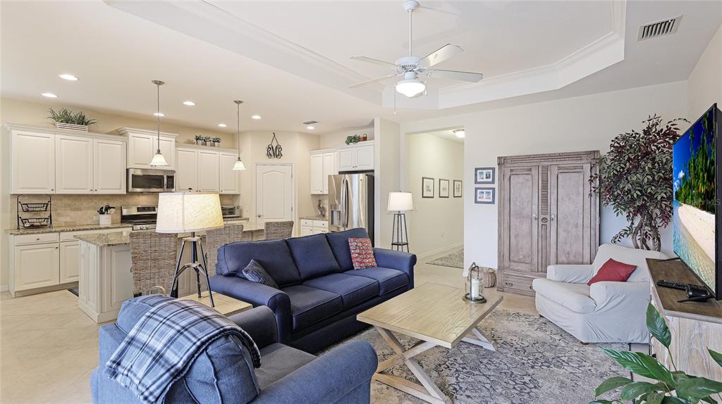Split Bedroom Walk-In Closet(s)Ceiling Fan(s) Eating Space In Kitchen High Ceilings Stone Counters Thermostat Open Floorplan Window TreatmentsCrown Molding Kitchen/Family Room Combo Tray Ceiling(s)Exterior Features: