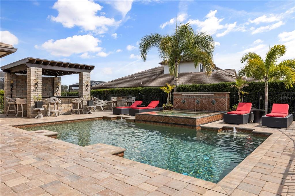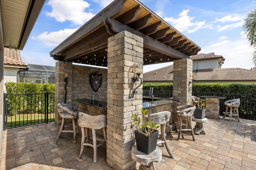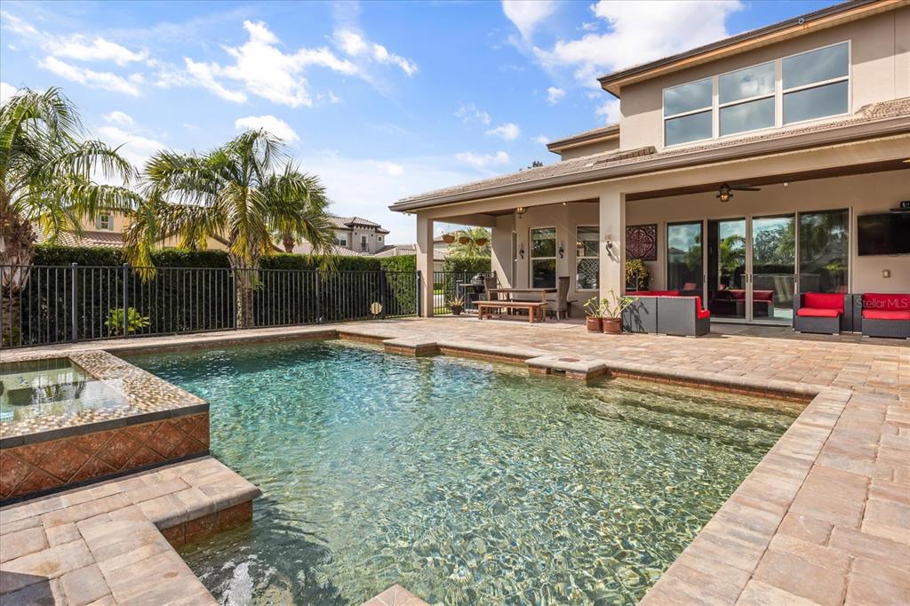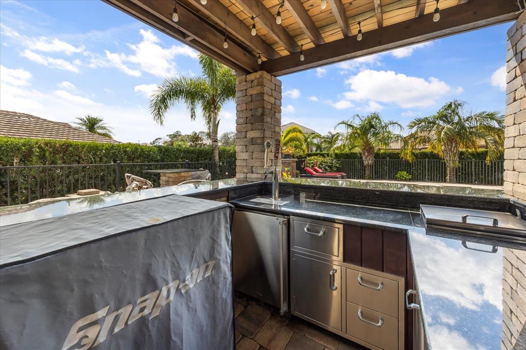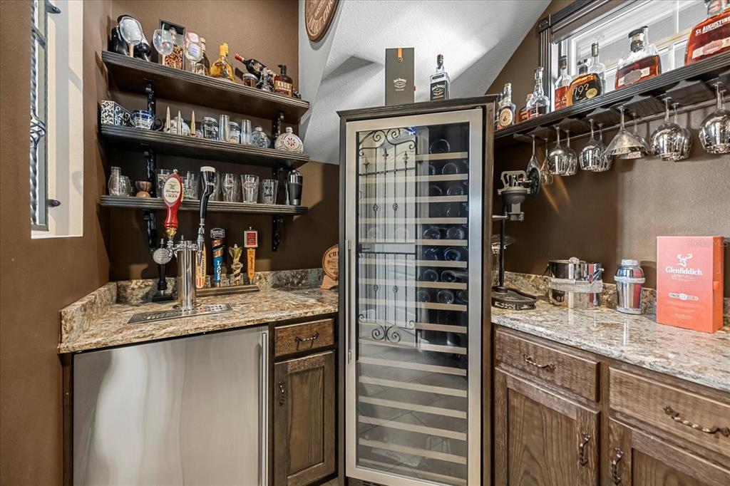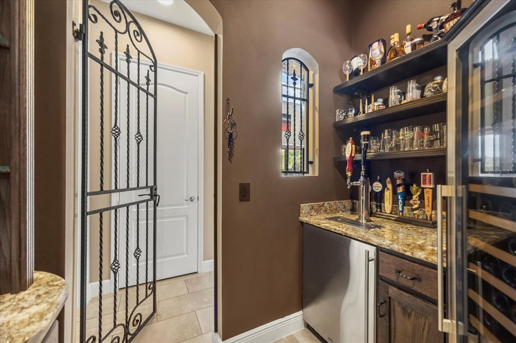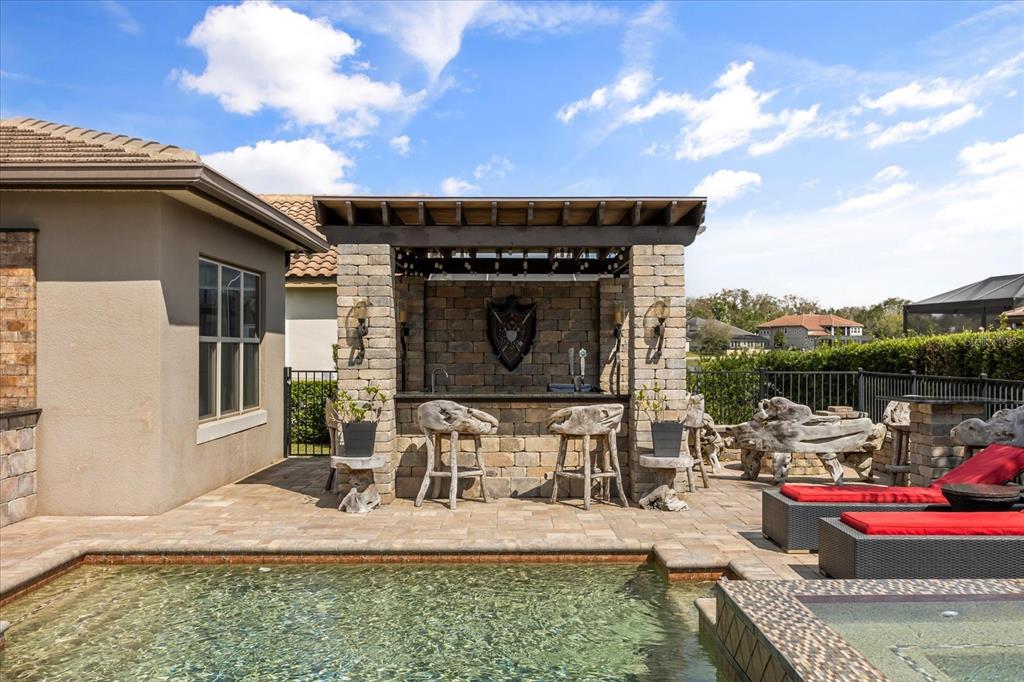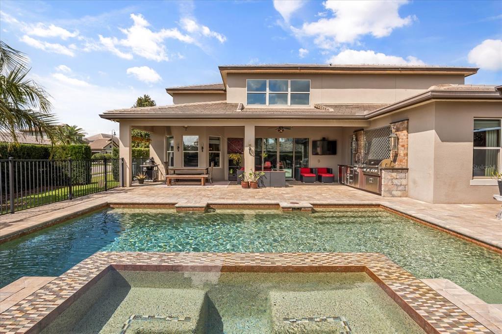 One or more photo(s) has been virtually staged. stunning “granada plan,” resort-style home in the heart of the gated steeple chase community located in lake mary. craftsman woodworking detailing throughout the home, and adorns this private, outdoor retreat from the tongue and groove wood ceiling in the expansive lanai to the decked-out summer kitchen including natural gas stove and grill, frig, and attractive, gas-lit coach lights. you can enjoy your saltwater pool and heated spa while relaxing in the outdoor bar. it's equipped with beer taps, storage, and a sink with plenty of seating options. a fence line of mature podocarpus shrubs surrounds this secluded outdoor space, and this area boasts surround sound speakers as well as mosquito control using all-natural products. upon entering, you will find a well- organized open concept. the gourmet style kitchen has a dual oven/microwave combo, a center island for extra prep space, tons of counter space sure to please, a walk-in pantry, and a farmhouse sink. unique to this home is a secluded wine room, with a wrought iron door entrance and window feature, welcoming you to the custom cabinetry and solid surface tops with its own beer tap . enjoy the generous great room overlooking the outdoor pool area. the oversized, private, first-floor master suite includes walk-in closets and a luxurious shower. it also has a soaker tub, dual vanity, and a water closet. first-floor office, with custom-built storage, wood floors, and a shoe cabinet has flexibility to be a guest room. upstairs, there are 4 bedrooms and 3 full bathrooms as well as a loft area that includes a beautiful built-in wall unit. the first- floor laundry room accesses the single-car garage as well as the driveway. a separate 2-car garage includes ceiling storage for all your needs. all this with an incredible location nearby to great schools, world-class dining, shopping, and a bustling business district and all major highways. this property may be under audio/visual surveillance. call today for your private home showing.3955 EQUINE, LAKE MARY, FL 32746